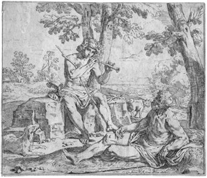 Merkur und Argus. Radierung. 26 x 30,5 cm. B. 31, Bellini 37 II. Wz. Fleurs-de-lis im Kreis.