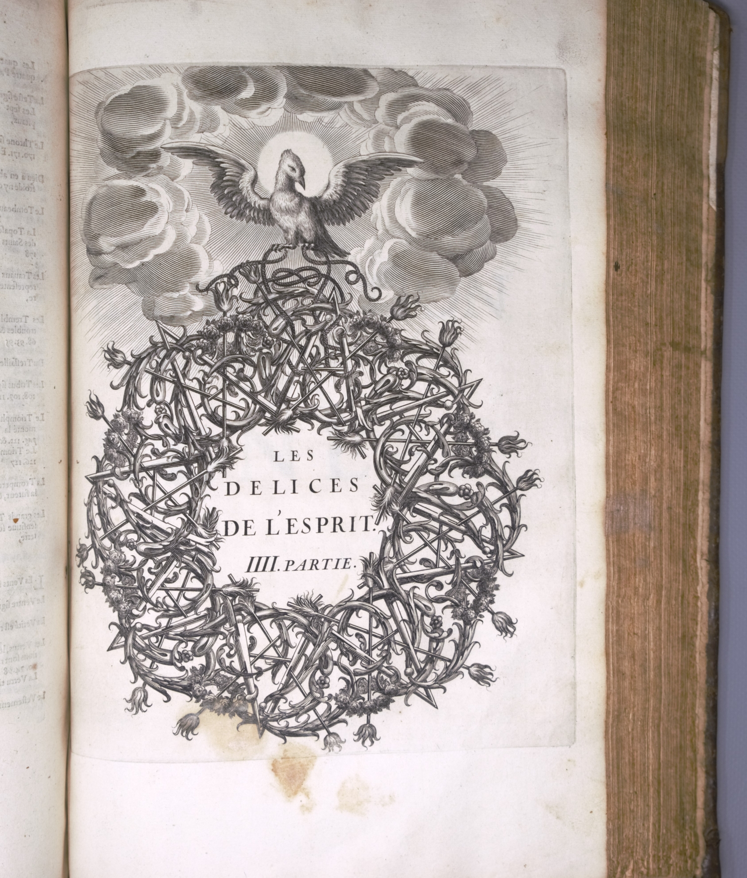 Desmarets (de Saint-Sorlin, Jean). Les délices de l'esprit. Dialogues dediez aux beaux esprits du monde. 4 Teile in 1 Band. Mit 4 Kupfertiteln, 18 Kupfertafeln und zahlreichen Holzschnittvignetten. 35,5 x 23 cm. Marmoriertes Leder d. Z. (leicht berieben und etwas fleckig) mit goldgeprägtem RTitel und RVergoldung. Paris, Florentin Lambert, 1661.