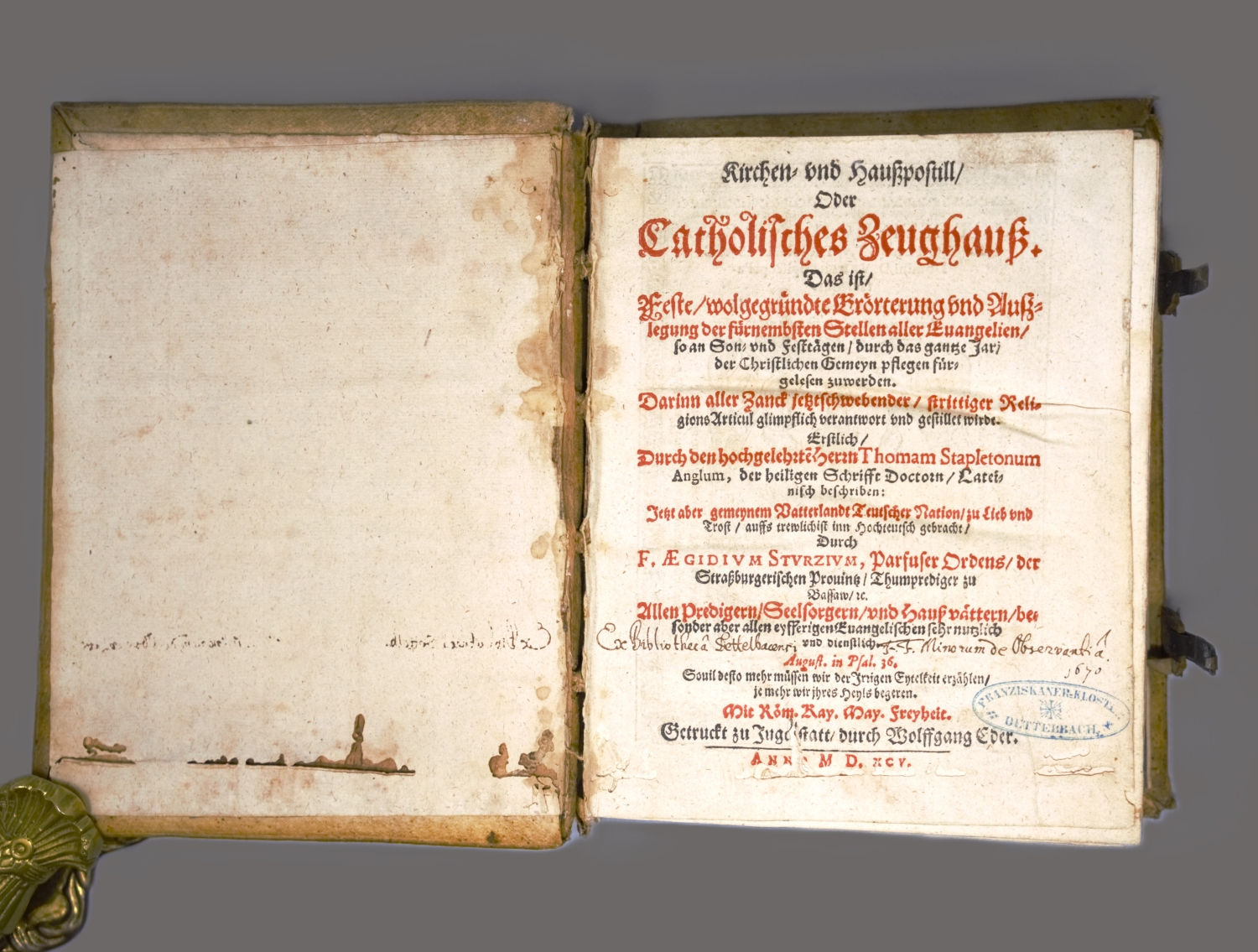 Stapleton, Thomas. Kirchen- und Hauspostill oder Catholisches Zeughauss, das ist feste wolgegründte Erörterung und Ausslegung der fürnembsten Stellen aller Evangelien. 26 Bl., 239 S., 341 S., 4 Bl. Mit Holzschnittwappen im Text und mit großer Holzschnittdruckermarke am Schluss. Titel in Schwarz und Rot. 20 x 15,5 cm. Schweinsleder d. Z. (stark berieben, bestoßen und gebräunt) über Holzdeckel mit zwei Messingschließen. Ingolstatt, Wolffgang Eder, 1695.
