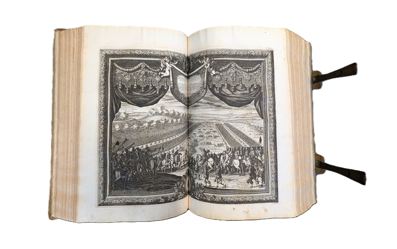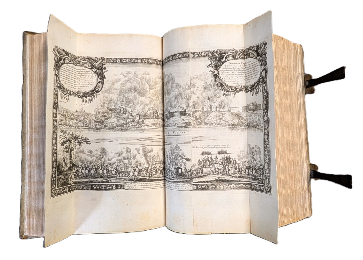 VD17 39:124163A. Ebert 18277. Graesse V, 504. Hiler 727. Vgl. Lipperheide Ci 47 (Ausgabe von 1729). – Erste Ausgabe des Hauptwerks des berühmten Historikers Samuel von Pufendorf (1632-1694). Mit dem Porträt von Karl XI. von Schweden "Carolus XI, suecorum, gothorum, et vandalorum rex" (und den nur einigen Exemplaren beigegebenen weiteren 11 Porträts). Die prächtigen Tafeln zeigen Pläne und Ansichten, Schlachten und Gefechte, Feldlager und Belagerungen, Empfang des türkischen Gesandten, das Treffen der schwedischen und dänischen Majestäten zu Frederiksborg u. v. m. Die Tafeln teils mit schönen Kartuschen, Barockeinfassungen und Staffagen. Unter den Ansichten Sandomir, Danzig, Warschau, Brest-Litowsk, Bromberg, Bremerförde, Mölln, Christianstad, Frederiksborg, Thorun, Helsingborg, Malmö, Greifswald, Cronenburg u. a. Die gewaltig große, meist fehlende Kupfertafel mit der Ansicht der Seeparade vom 3. November 1660 vor Stockholm anlässlich des Begräbnisses des schwedischen Königs Carl Gustav (Karl X.) ist von 12 Platten gedruckt und misst 35 x 450 (!) cm. – Das letzte Blatt und die Tafeln 19, 46, 51, 68, 70-72, 74, 76, 85, 90, 96, 106 und 110 fehlen. Hs. Eintrag im Vorsatz. Ab und an etwas fleckig. Die ersten Blätter mit einem Wasserfleck im Rand. Dieser und teils der Satzspiegel stärker gebräunt, einige der Tafeln betroffen. Ab S. 604 etwas wurmstichig (wenige der Tafeln mit leichtem Darstellungsverlust). Insgesamt gutes und nahezu vollständiges Exemplar.