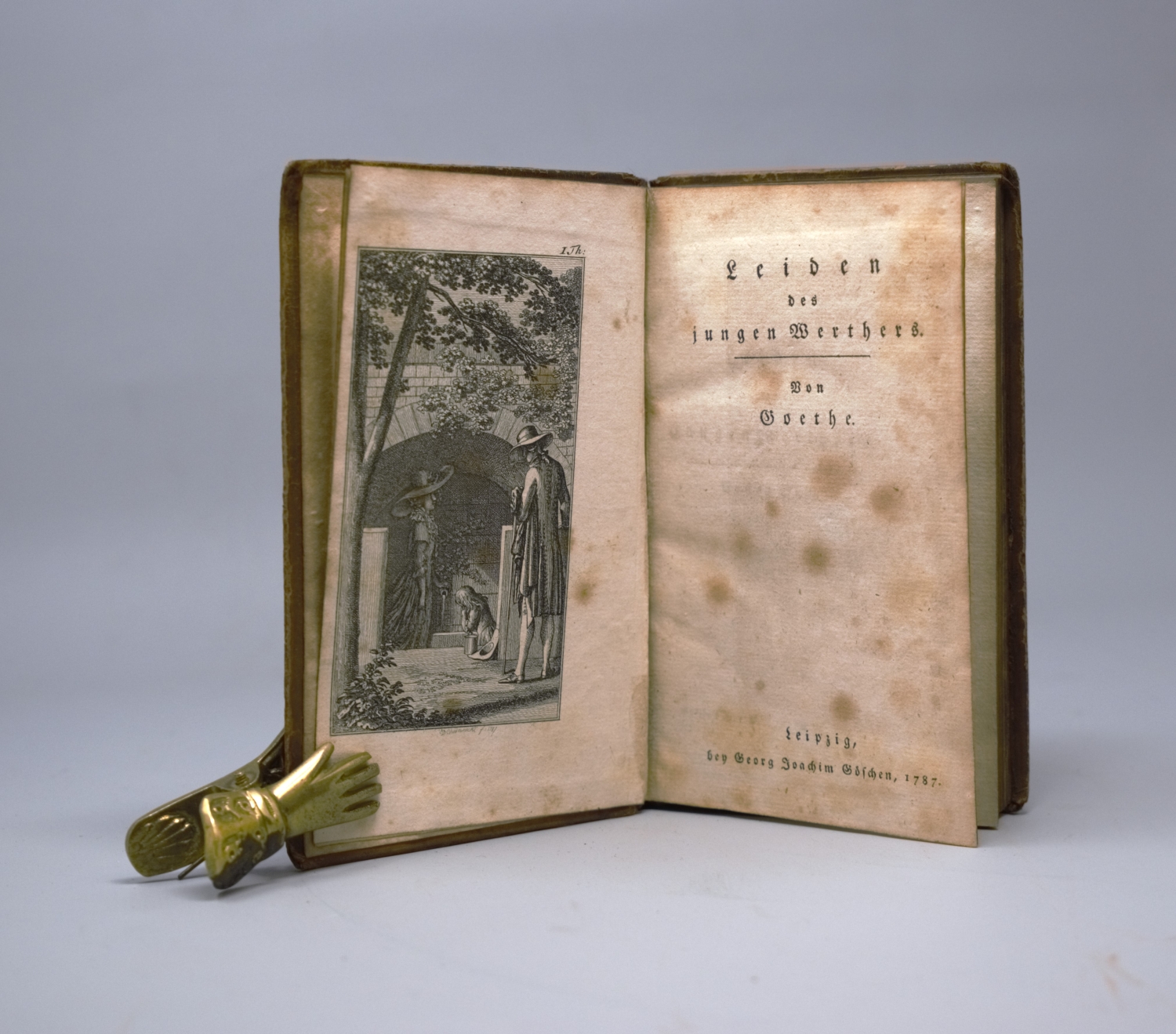 Goethe, Johann Wolfgang von. Leiden des jungen Werthers. 1 Bl., 310 S. Mit gestochenem Frontispiz von Daniel Chodowiecki. 16 x 9,5 cm. Leder d. Z. (berieben, Ecken und Kanten beschabt, VDeckel gelockert). Leipzig, Georg Joachim Göschen, 1787.