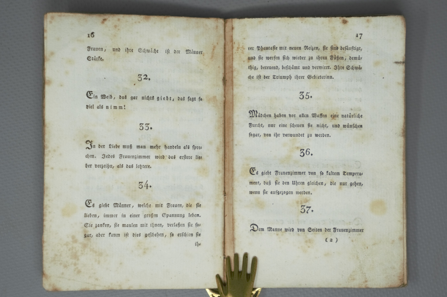 VD18 11704667. Hayn-Gotendorf I, 98. – Erste Ausgabe der im klandestinen Kleinformat gedruckten erotischen Sammlung von "254 meist recht geistreichen, witzigen und pikanten (Aphorismen) über Weiber und Mädchen, Liebe, Ehe, Koketterie etc." (H.-G.), zusammengestellt von dem nur am Schluss des Vorworts genannten und biographisch nicht zu ermittelnden Verfasser Graf von Klingberg. "Höchst selten!" (ebenda). Ein Neudruck erschien ebenda um 1860. – Stockfleckig, Titel auch etwas gebräunt sowie verso gestempelt.
