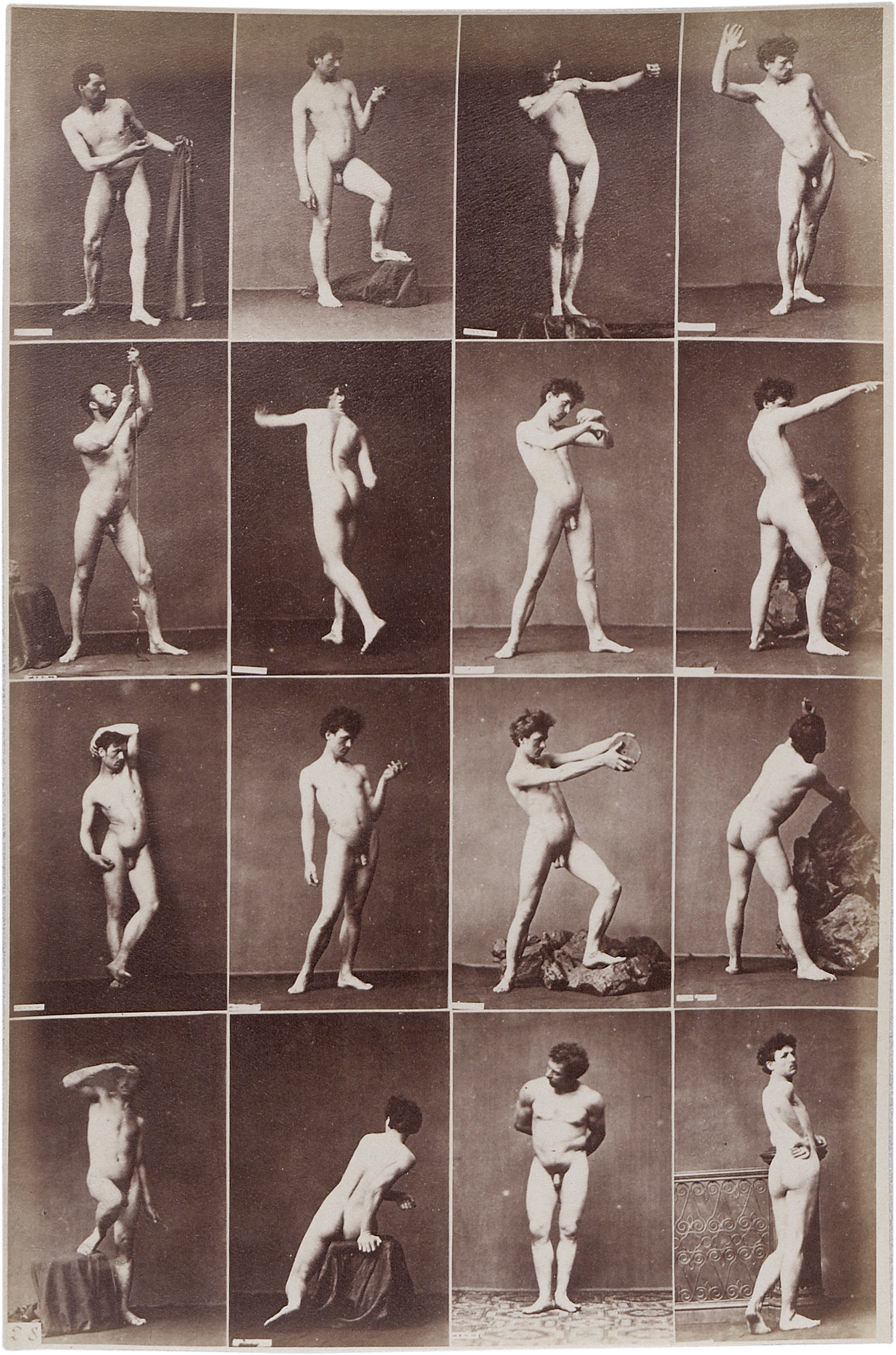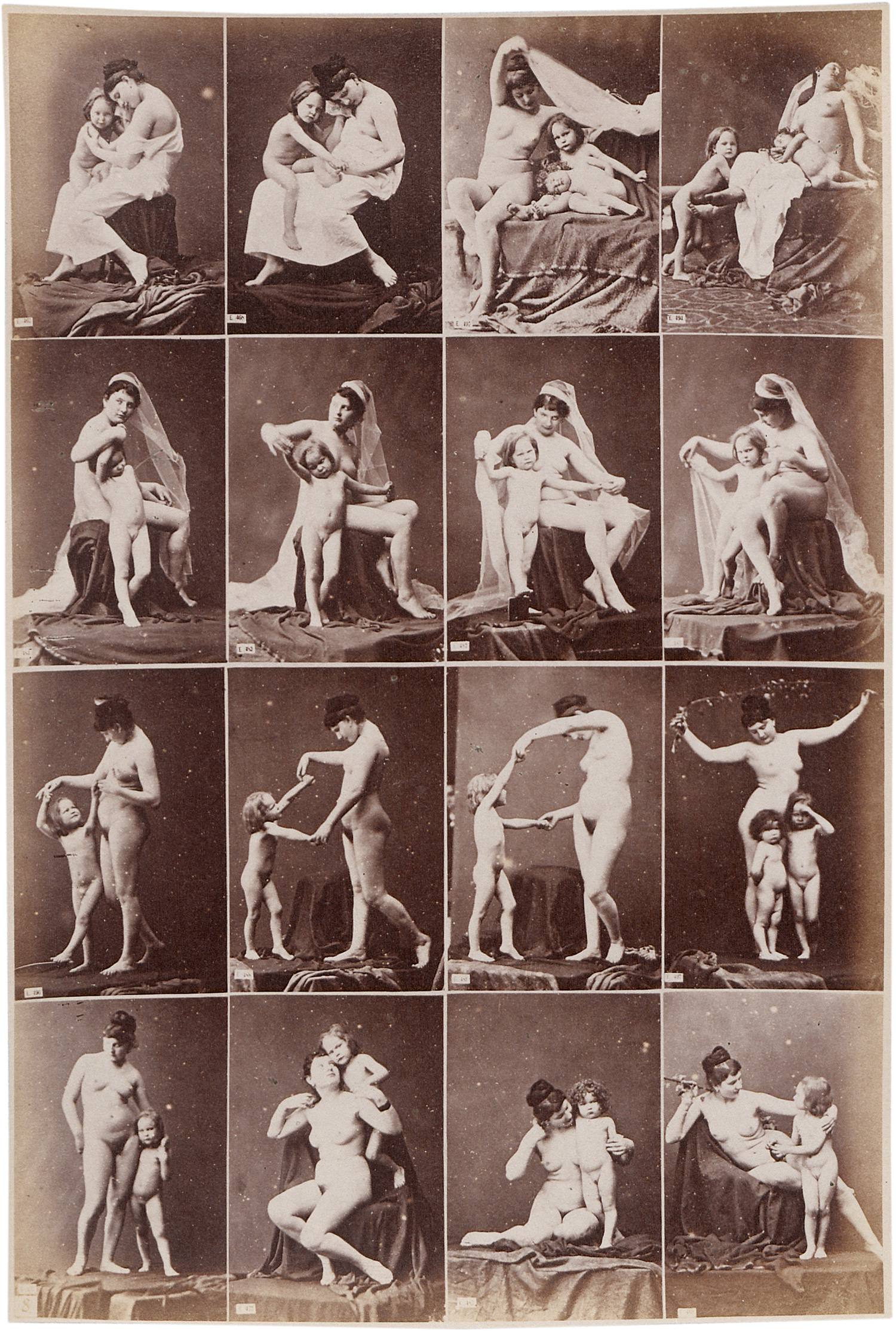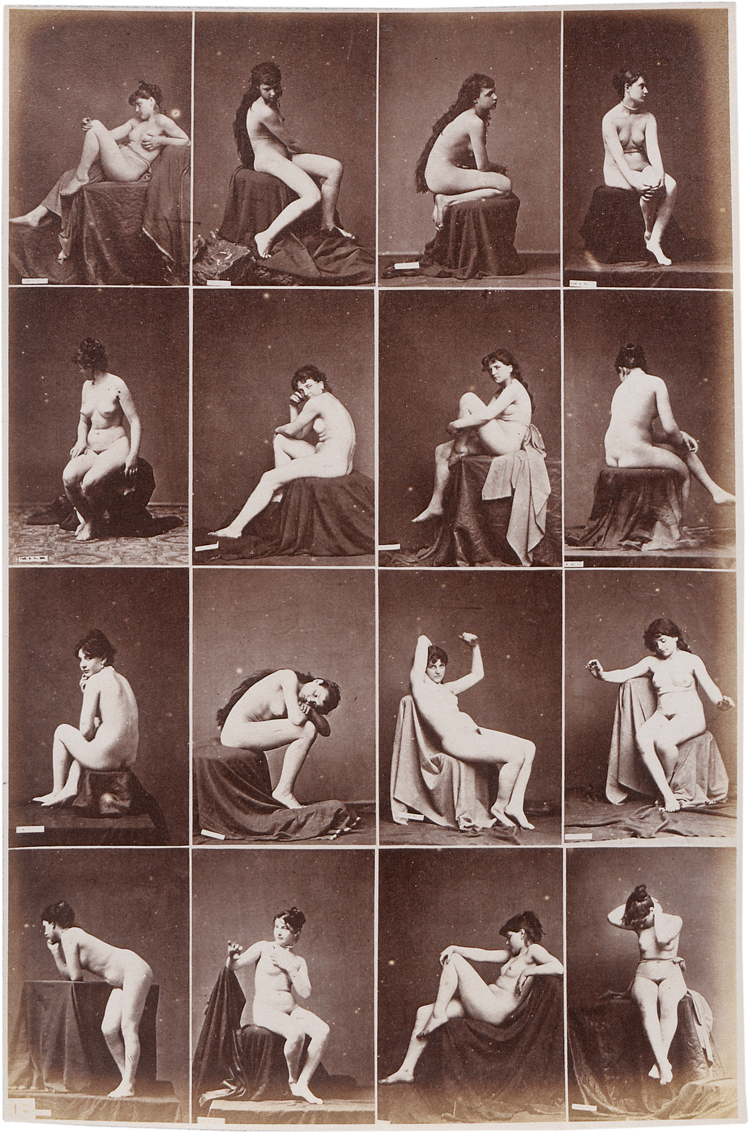 Album d’Études-Poses. 1880s. 39 albumen prints, mounted to album pages. Each ca. 20,5 x 14 cm (30,5 x 24,5 cm). Bound in original half-cloth folio album with gilt-stamped title “Album d’Études-Poses” on the spine as well as printed publisher’s caption “A. Calavas Éditeur, - 68, Rue de Lafayette, PARIS.” on each mount.