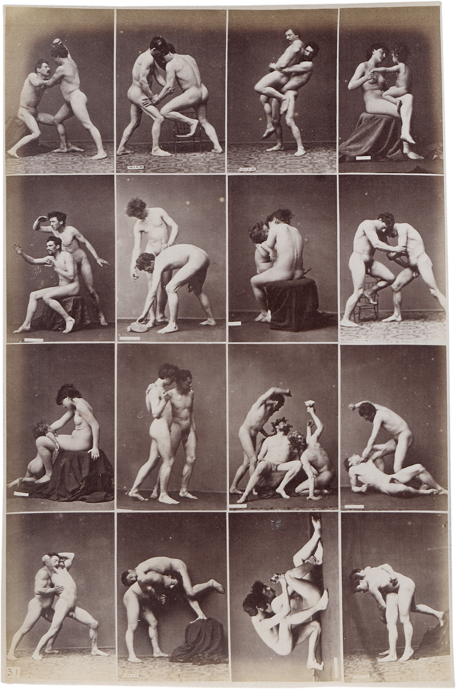 This instructional album by Louis Igout was produced around 1880 as a visual aid for artists, sculptors, and illustrators aiming to master anatomy, gesture, and classical composition. Published by A. Calavas in Paris, the album features carefully posed nude studies of men, women, and children, referencing scenes from mythology, antiquity, and the Bible - including Cain and Abel, The Dying Gaul, Hercules and Antaeus, The Drunken Silenus, and the Cnidian Aphrodite, among others. Rendered with academic precision, the photographs served both as instructional models and as a catalogue from which artists could order enlarged prints tailored to their specific needs. A similar album is in the collection of the Metropolitan Museum, New York. – Some fading, especially around the edges, some scuff marks; a few prints with white spots; otherwise mostly strong in tone and in good to very good condition.