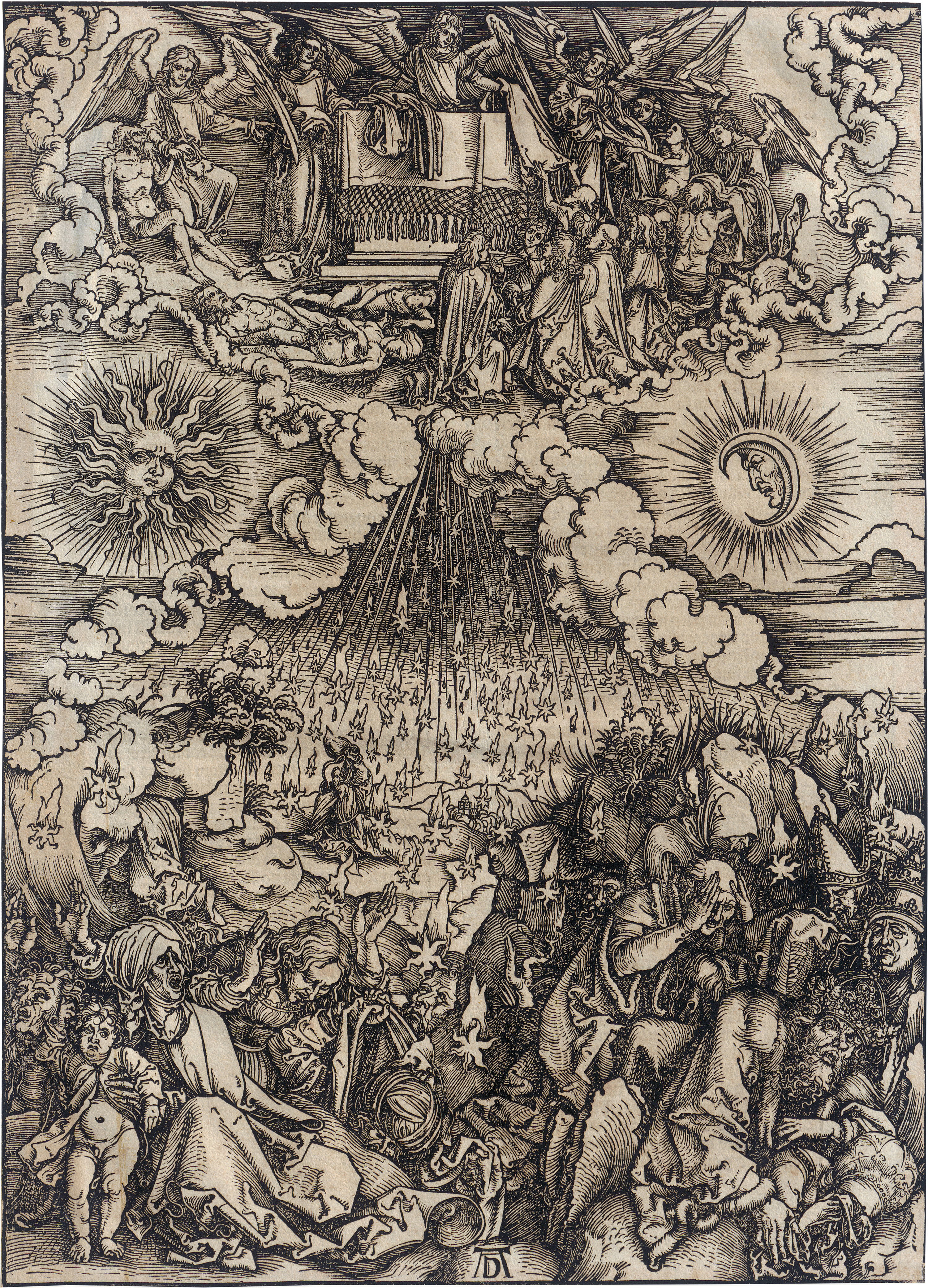 Eröffnung des sechsten Siegels (Der Sternenfall). Holzschnitt. 39,3 x 28,1 cm. Um 1496-1498. B. 65, Meder 168, lateinische Ausgabe von 1511. Wz. Turm (Meder 259).
