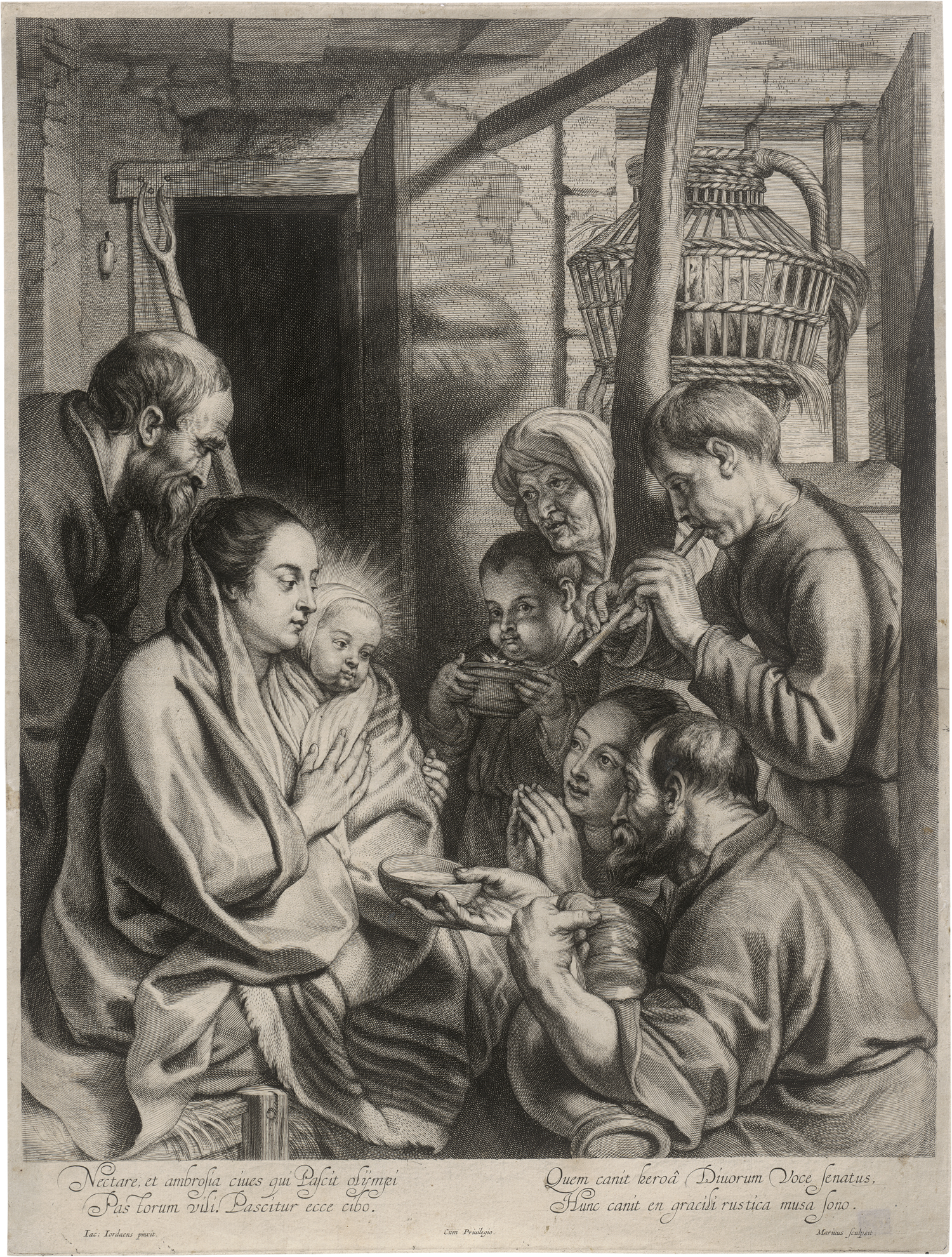 Biografische Details zum Leben von Marinus van der Goes sind spärlich. Zusammen mit Hans Witdoeck war er um 1630 zunächst Schüler von Lucas Vorsterman, bevor er in die Antwerpener Lukasgilde aufgenommen wurde und um 1632 den Titel eines Freimeisters erhielt. In den nur wenigen verbleibenden Lebensjahren - er starb bereits 1639 - war er hauptsächlich als Reproduktionsstecher tätig und arbeitete unter anderem nach Vorlagen von bedeutenden Zeitgenossen wie Rubens, Cornelis Saftleven, Adriaen Brouwer und Jacob Jordaens. Hollstein zählt insgesamt lediglich 20 Blatt zu seinem Œuvre. Die vorliegende Komposition gibt ein Gemälde von Jacob Jordaens wieder, das sich heute im Museum Mayer van den Bergh in Antwerpen befindet. Bei unserem Exemplar handelt es sich um einen von Hollstein unbeschriebenen Druckzustand: Zwar sind schon die Überarbeitungen des dritten Zustandes sichtbar, darunter die Ergänzung des vierten Fingers an der Hand unter dem Hühnerkäfig, gleichzeitig findet sich, wie für den zweiten Zustand kennzeichnend, im unteren Rand noch der Zusatz „Cum Privilegio“.