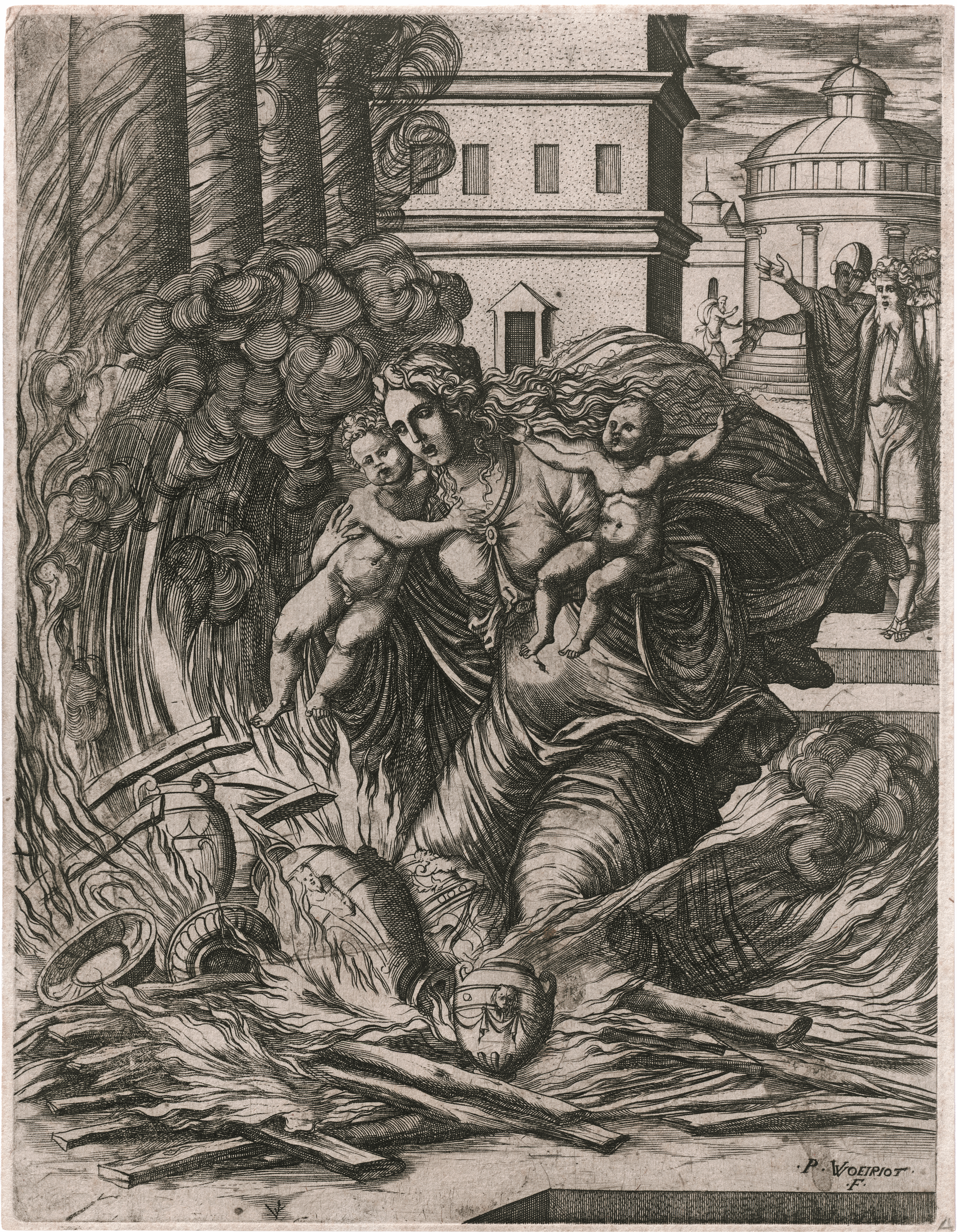 Hasdrubals Frau stürzt sich in den brennenden Tempel. Radierung nach Baldassare Peruzzi. 22,2 x 17 cm. Robert-Dumensil 206, Le Blanc 89.