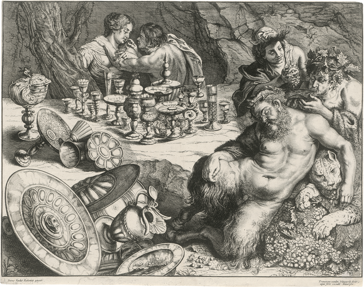 Bacchus und der trunkene Silen, oder: Der Satyr mit den Prunkgefäßen. Kupferstich nach Peter Paul Rubens. 33,5 x 42,9 cm. Wurzbach 13, Hollstein 15. Wz. Wappenkartusche mit Schriftzug.