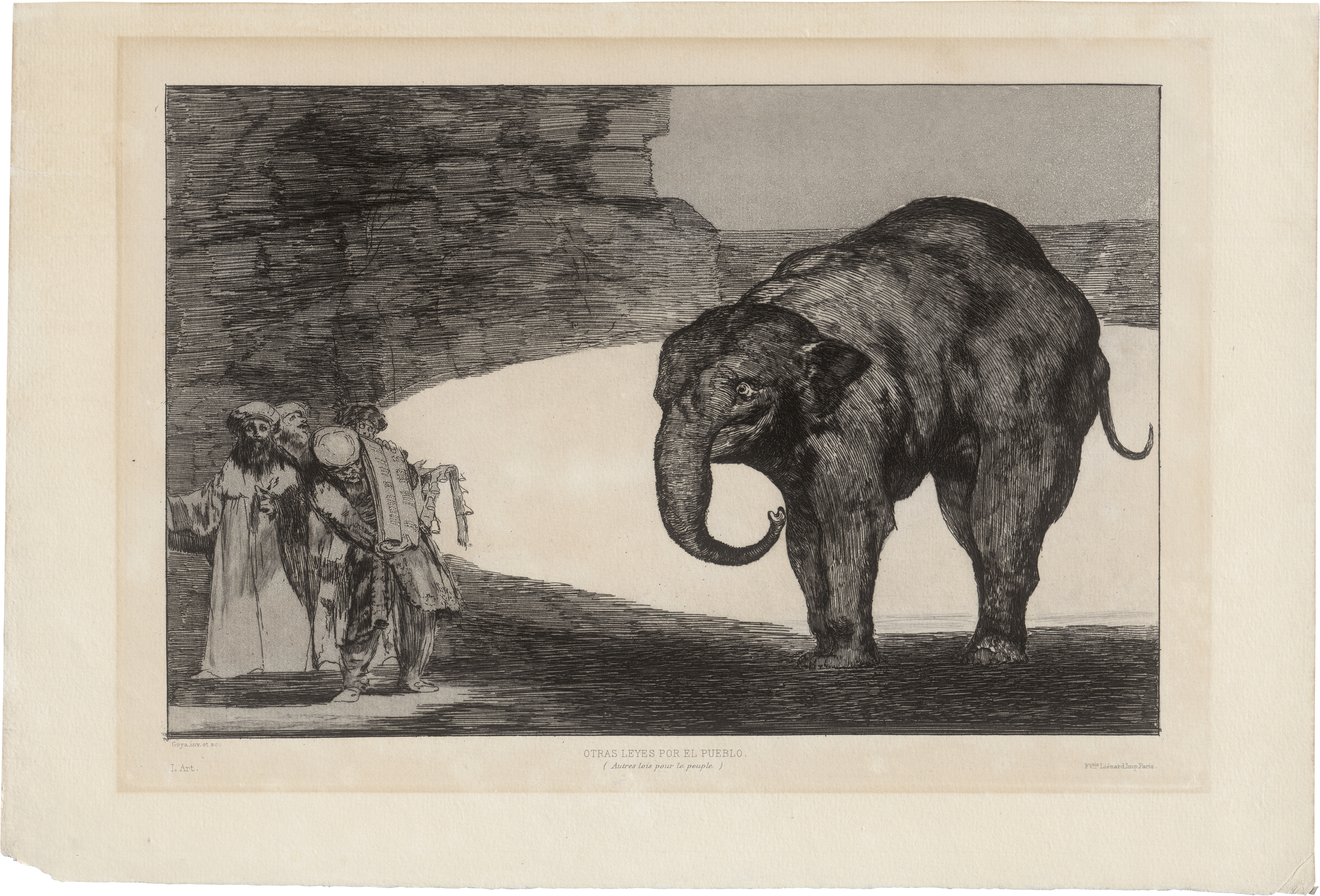 Blatt 3 der zusätzlichen vier Blätter zur Folge, vor der bei Delteil beschriebenen Löschung des Textes. Die surreal anmutende und sicherlich politisch zu verstehende Szene im Zusammenhang mit dem spanischen Sprichwort "Poner el cascabel al gato", also etwa "Der Katze die Glöckchen anlegen". Nach Harris steht der katzbuckelnde aber friedliche Elefant für das große und mächtige Volk, dem von einer verängstigt im Schatten stehenden Gruppe von Orientalen, die die herrschenden Eliten darstellen, ein neues Gesetz vorgeschrieben und damit das entmachtende und zähmende Glöckchenhalsband angelegt werden soll. - Prachtvoller, kräftiger Abzug mit Rand. Angestaubt, lichtrandig, kleine Randläsuren, links oben im weißen Rand geschlossener Einriss, verso gebräunt, sonst schön.