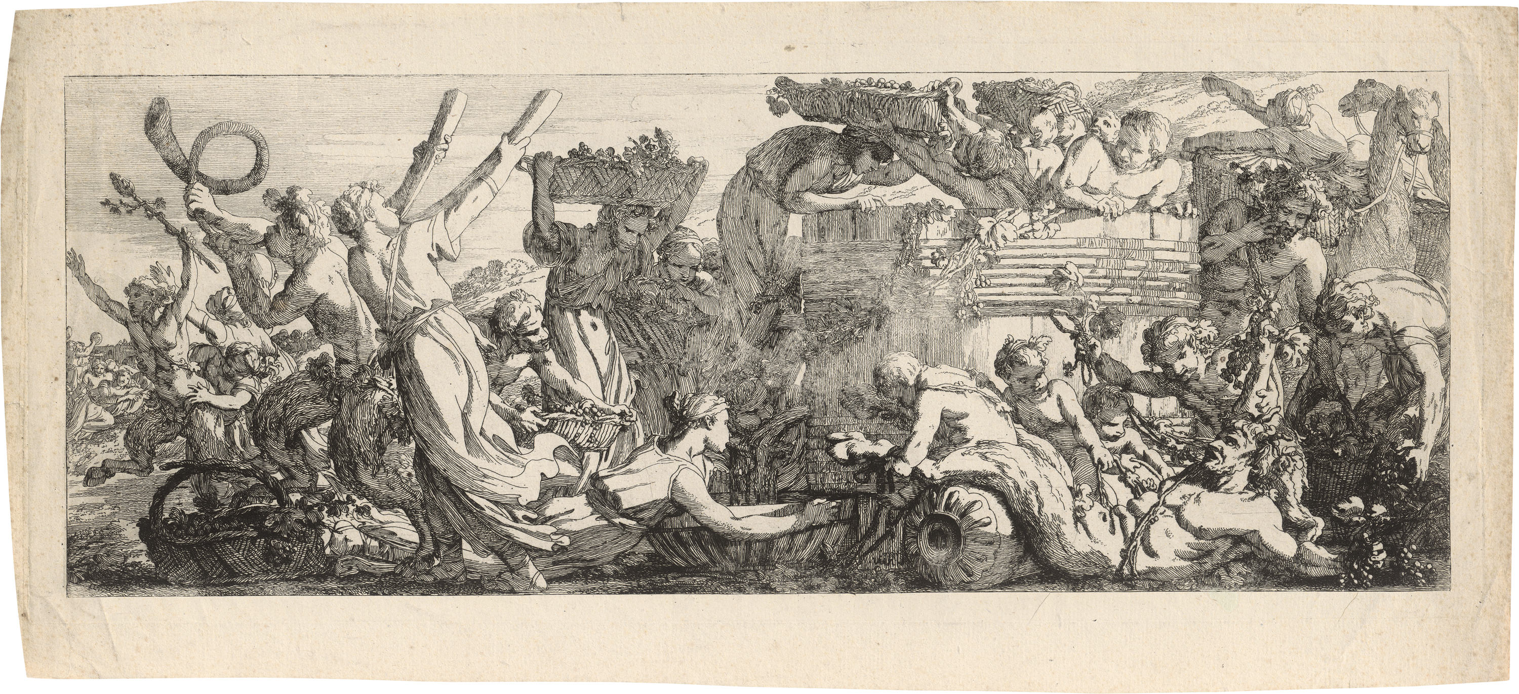 Bacchanal (Die Ankunft am Weinbottich). Radierung. 17,8 x 44,7 cm. Baudicour 6, Le Blanc 6. Wz. Große Kartusche.