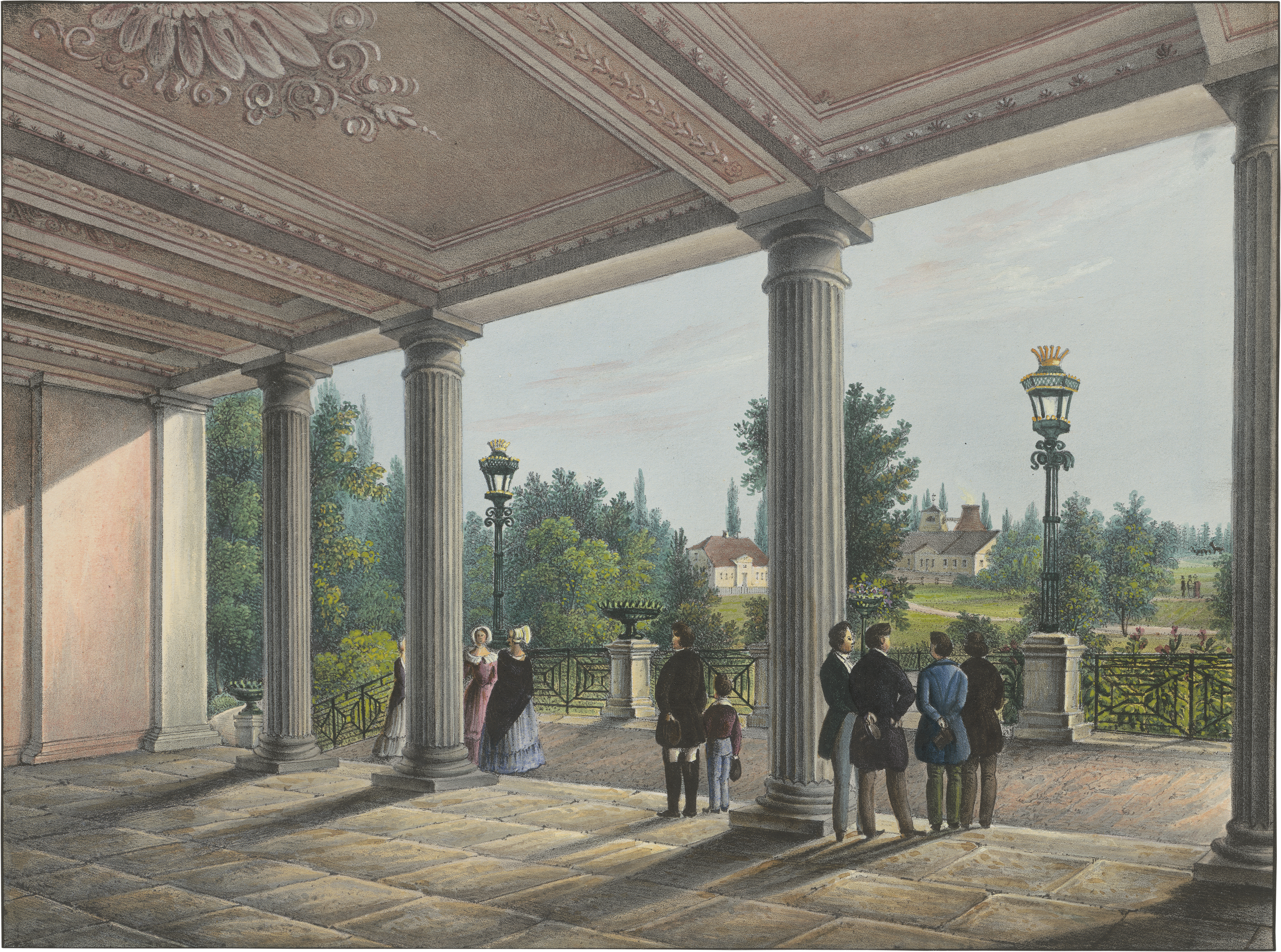 Ansicht aus der Vorhalle von Schloss Slawentzitz (Sławięcice) auf die Zinkhütte. Kreidelithographie, aquarelliert, auf hellgrünem Untersatzpapier mit Einrahmungslinien in schwarzer und weißer Feder. 18,1 x 24,3 cm.
