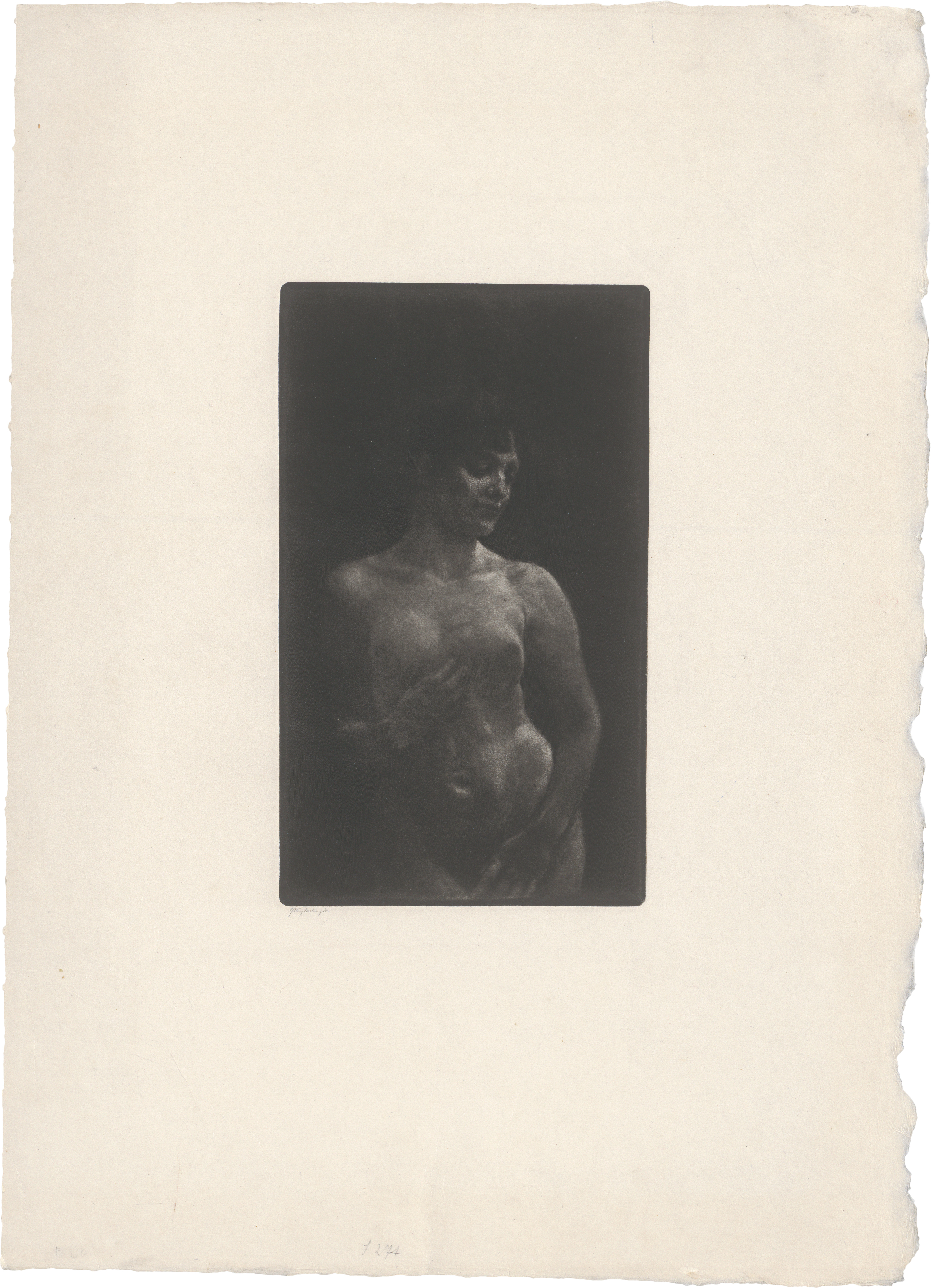 Weiblicher Akt (in Schabkunst). Schabkunstblatt mit Radierung auf Similijapan. 28,9 x 17 cm. Unterhalb der Darstellung im weißen Rand vom Verleger signiert "OFelsing Berlin gdr". (1891). Singer 271 II (von III).