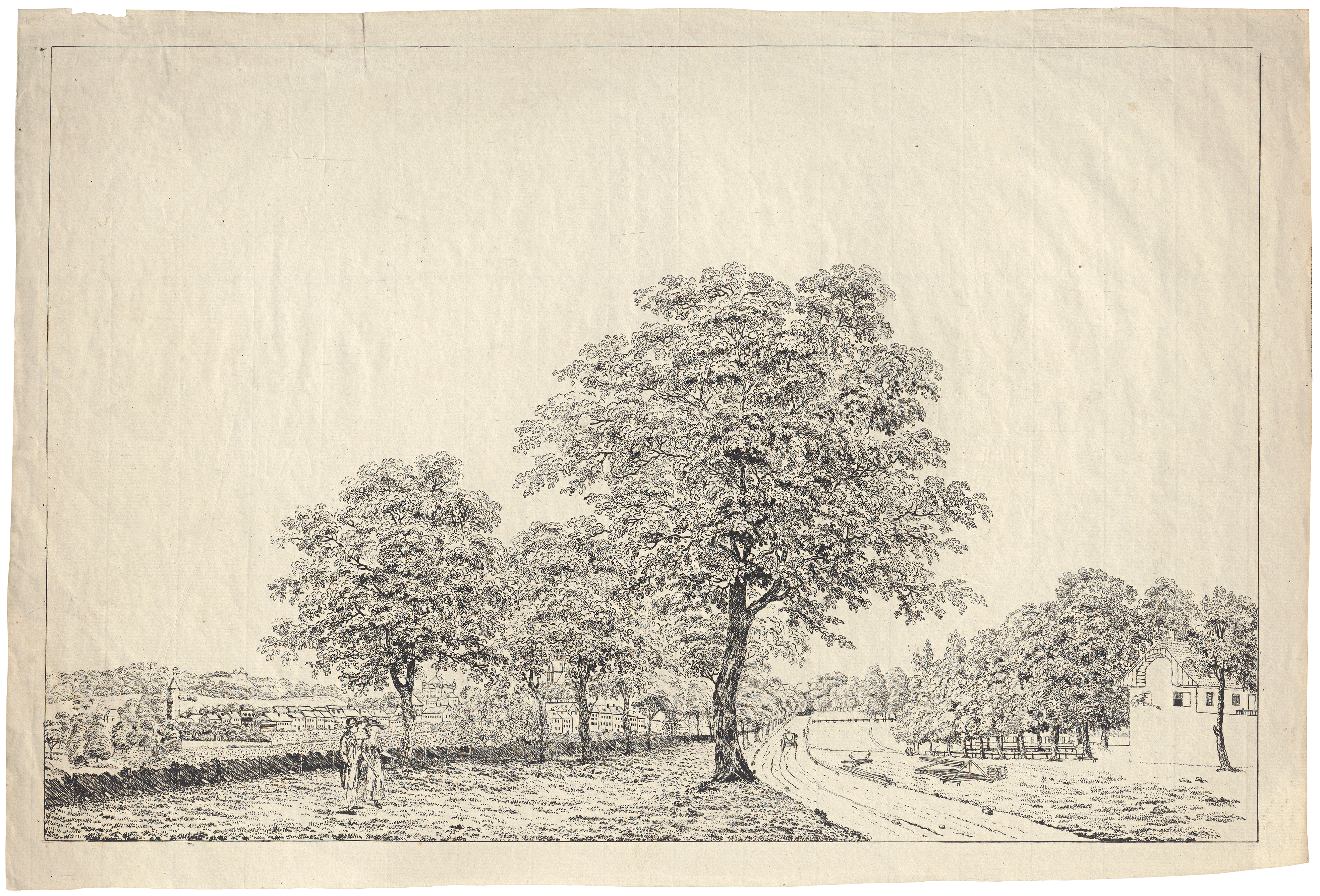 Landschaft mit baumbestandenen Feldweg, ein Paar im Vordergrund links und einer schweizer Stadt im Hintergrund. Radierung. 33,7 x 49,7 cm. Um 1760. Wohl nicht in Nagler. Wz. Lilienwappen mit Schrift C & I Honig.