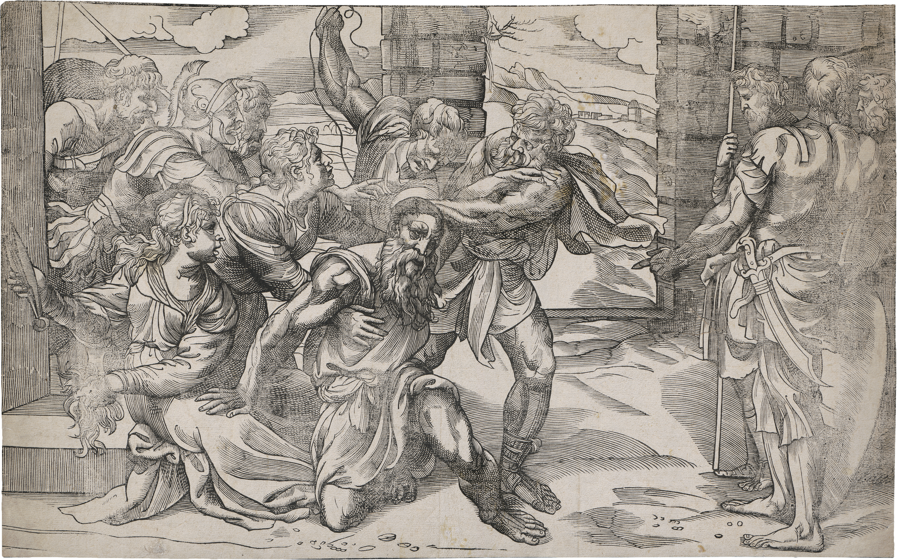 Samson und Delilah (Samsons Gefangennahme). Holzschnitt nach Tizian. 30,2 x 49 cm. Passavant VI, S. 223, 5, Dreyer 10, Muraro/Rosand 48. Wz. Bekröntes Bandenwappen.