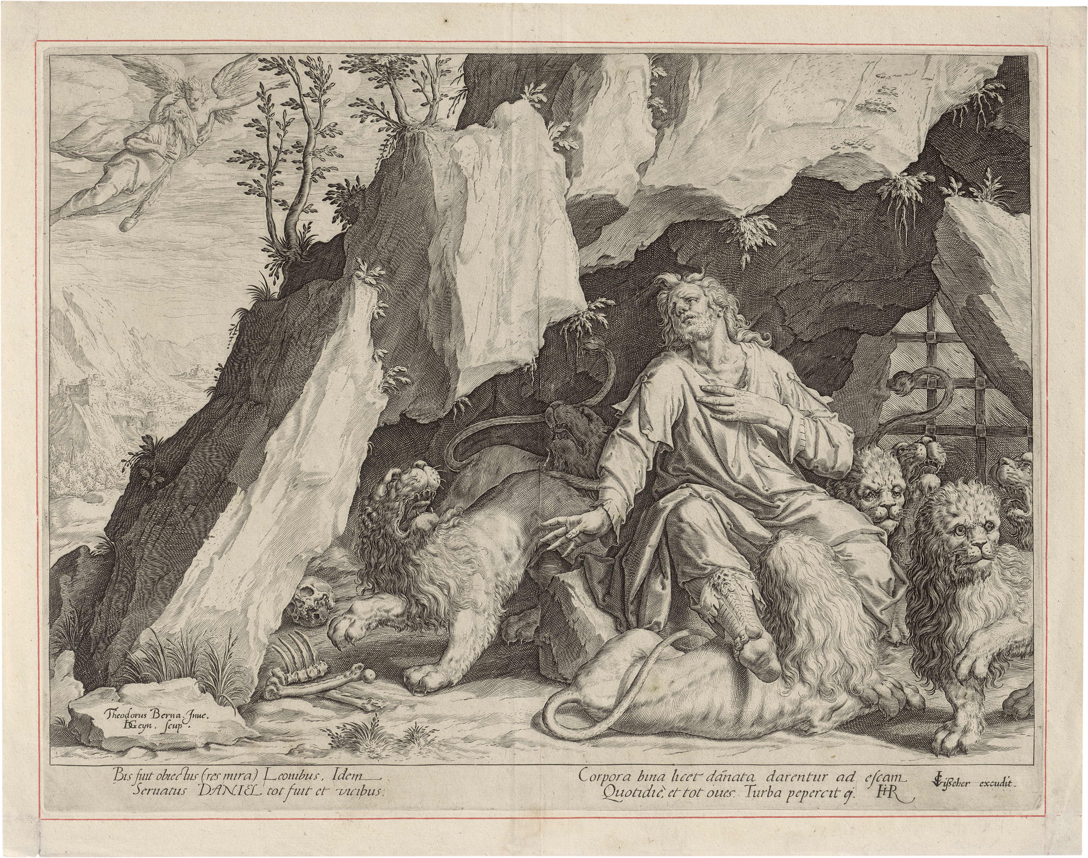 Daniel in der Löwengrube. Kupferstich nach Dirck Barendsz. 27,4 x 35,6 cm. Filedt Kok/Leesberg (New Hollstein) 25 II. Wz. Nebenmarke P.