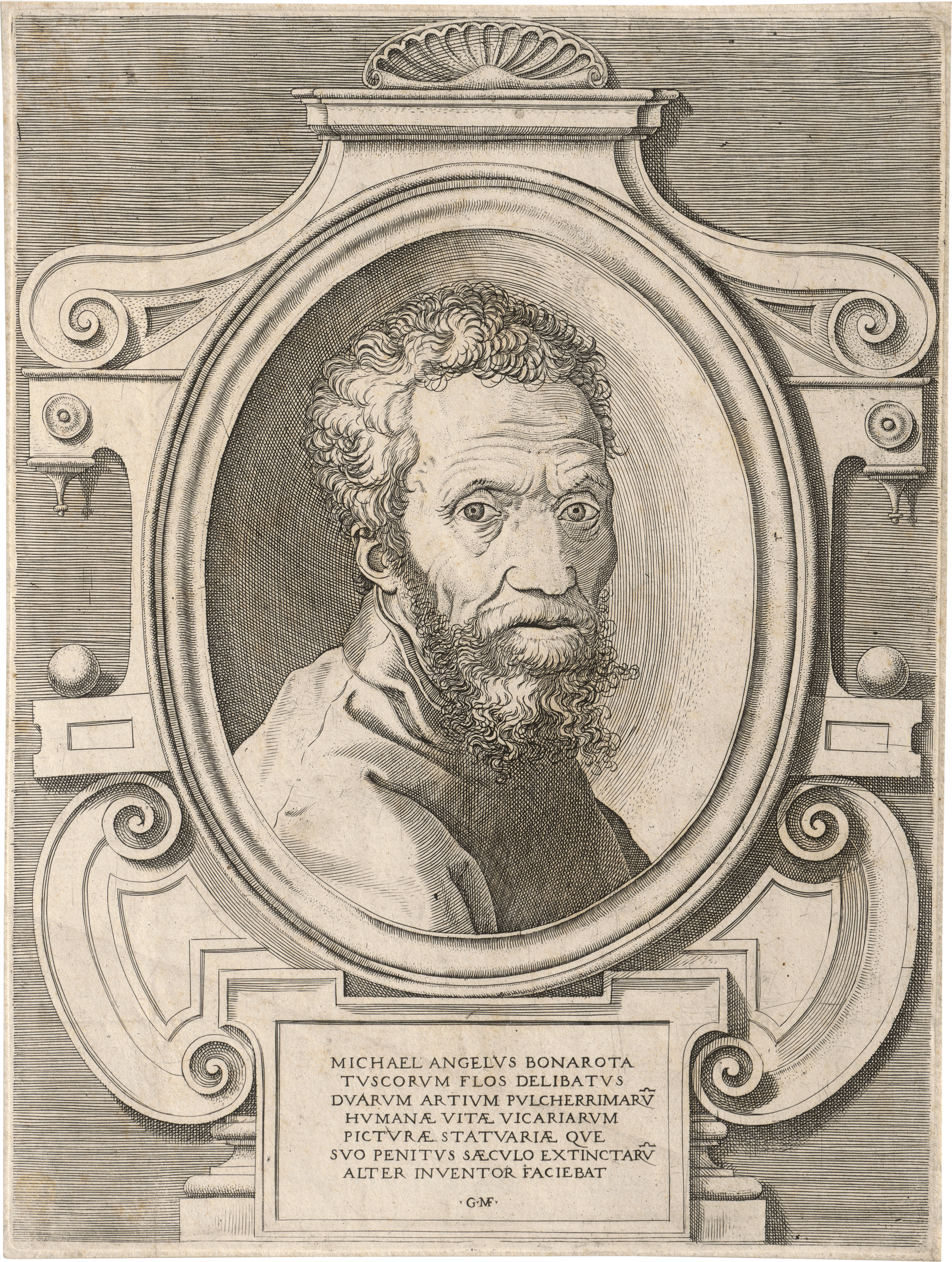 Portraitbüste des Michelangelo Buonarotti. Kupferstich nach Marcello Venusti. 26,8 x 19,9 cm. (1564). B. 71, Massari 182, Lewis/Lewis 39.