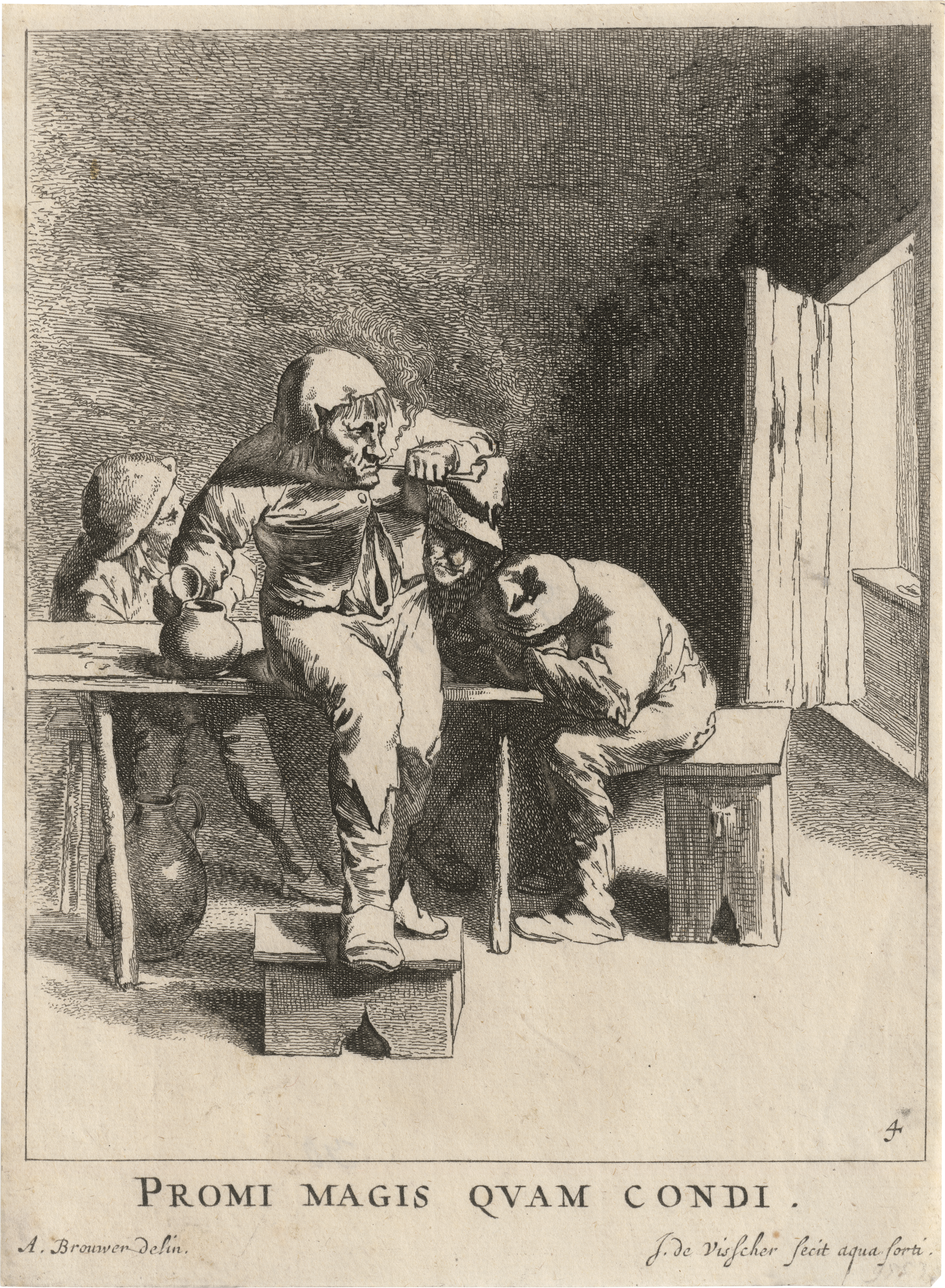 Das erste und das Schlussblatt einer vierteiligen Folge mit Bauerninterieurdarstellungen. Ausgezeichnete, markante Drucke mit sehr feinem bzw. schmalem Rändchen um die Einfassungslinie, unten mit dem Schriftrand. Geringfügig fleckig und altersspurig, sonst gleichwohl sehr gut. Beigegeben von Cornelis Visscher die Radierung "Die Unterhaltung" (Hollstein 45).