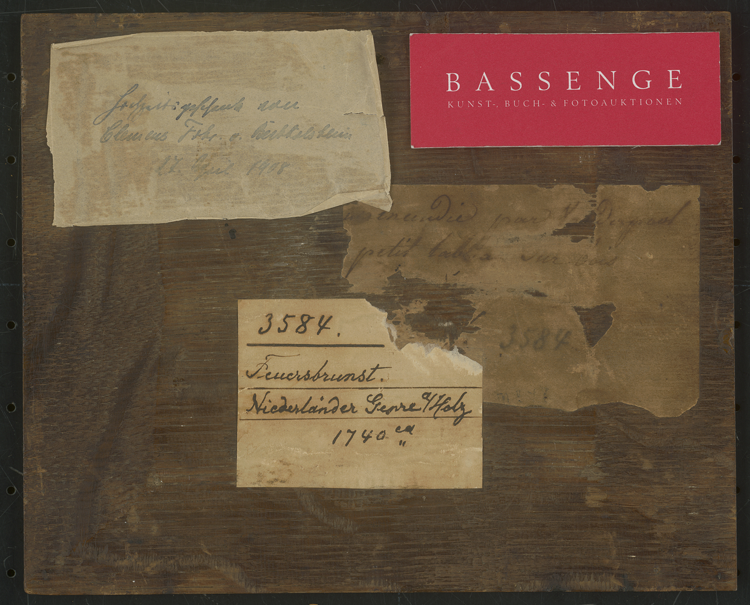 Öl auf Holz, an vier Seiten abgefast. 16,9 x 20,6 cm. Verso mit alten Etiketten "Incendie par Van Depool / petit tableau sur bois" und "Hochzeitsgeschenk von / Clemens Frhr. von Bechtolsheim / 27. April 1908".