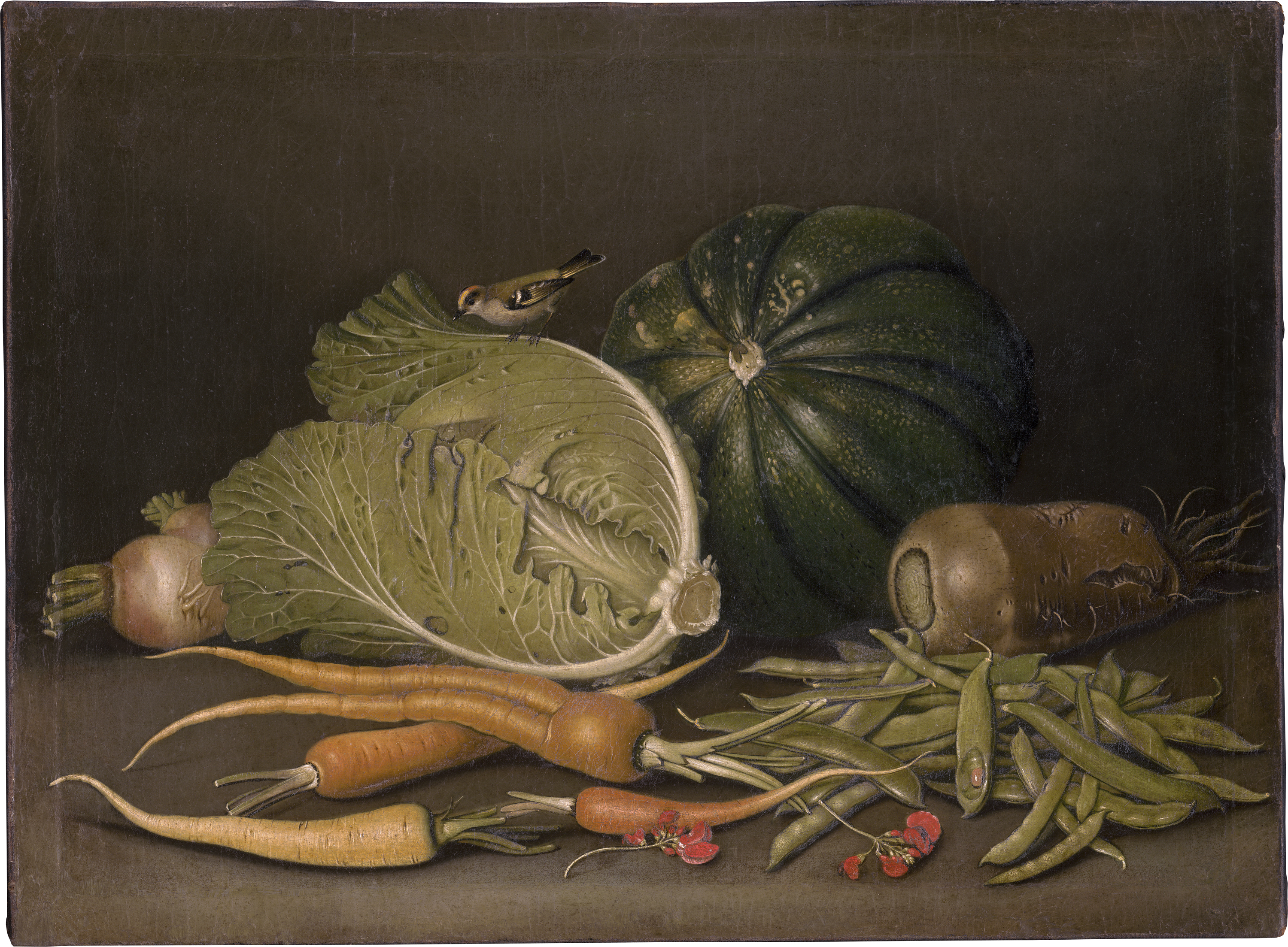 Gemüsestillleben mit Weißkohl, Kürbis, Wurzel- und Rübengemüse, Stangenbohnen und einem Fink.