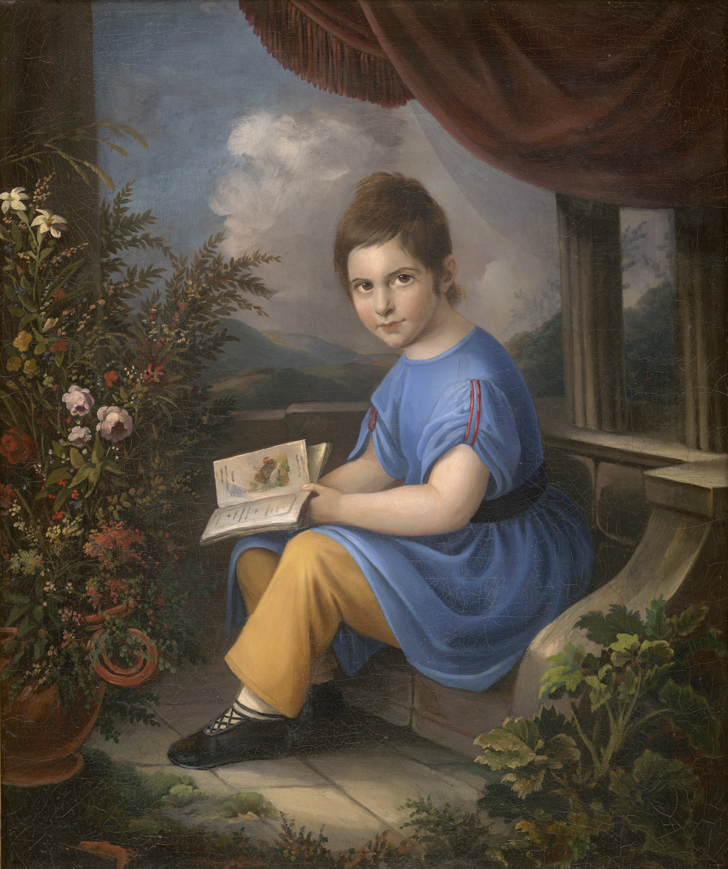 um 1830. Knabe in blauem Kittel mit Bilderbuch auf einer Terrasse