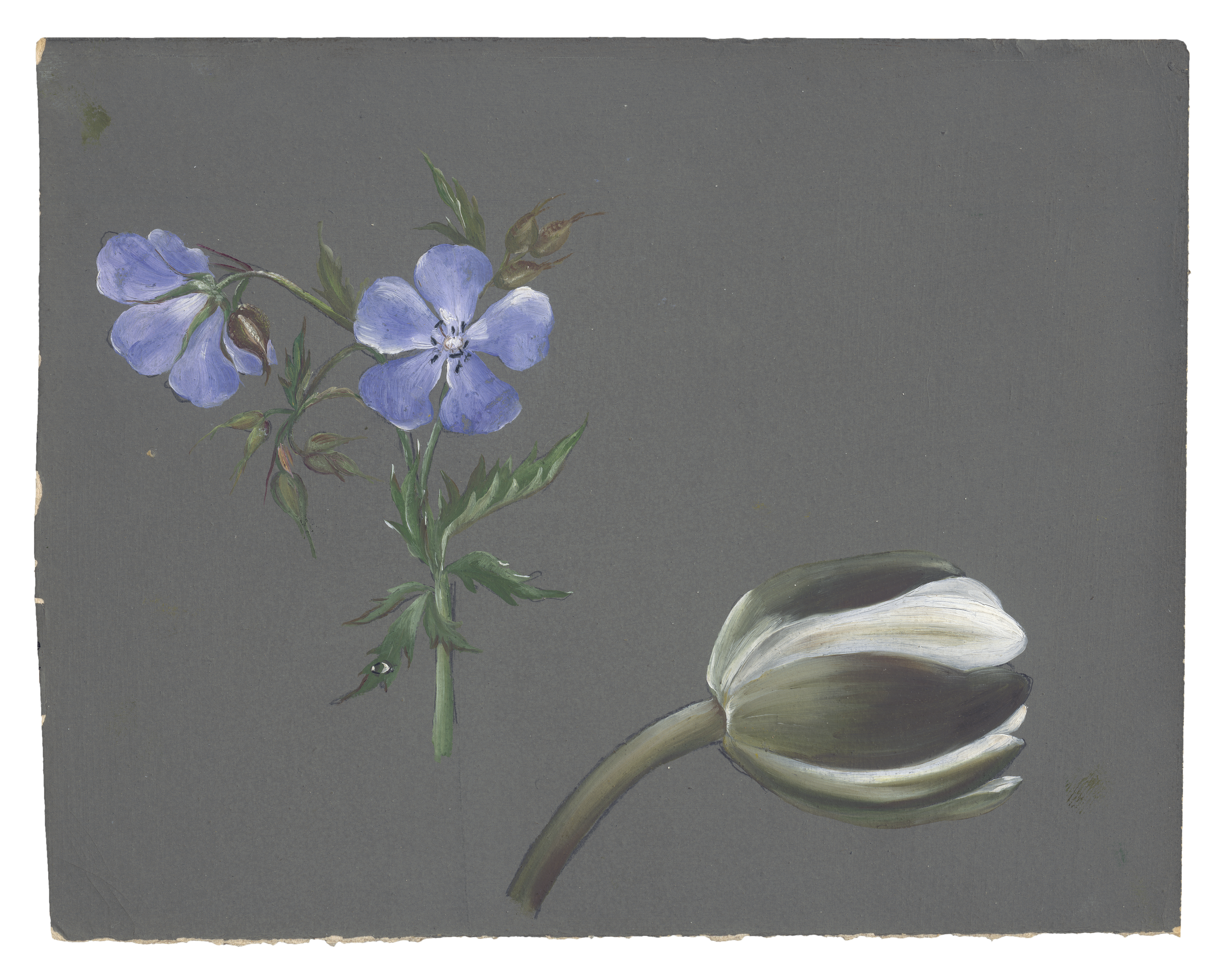 (1859 Kopenhagen - 1944)Studienblatt mit violettem Wiesenstorchschnabel und weißer Tulpe