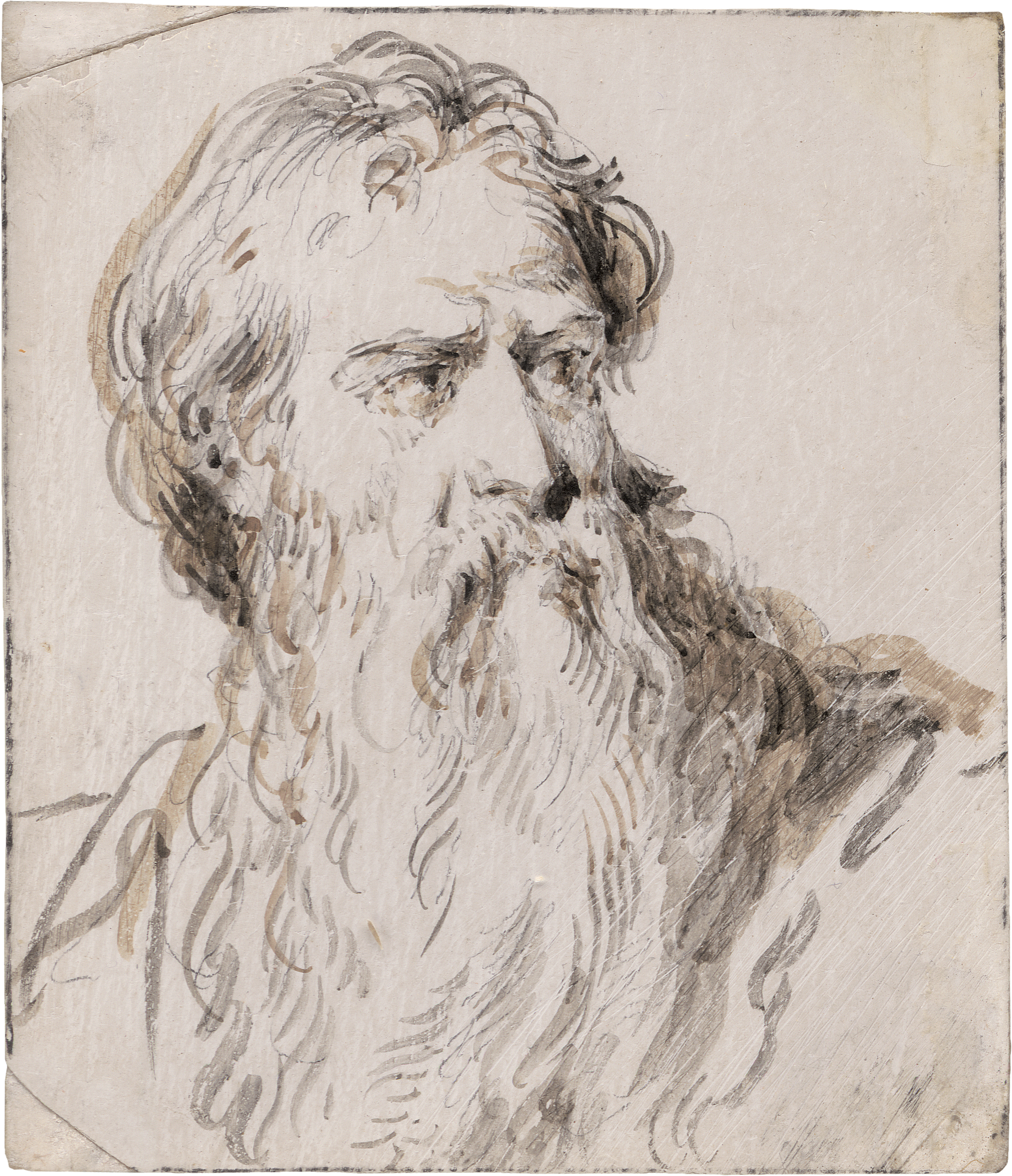 2 Zeichnungen (recto und verso), je Graphit, Pinsel in Hell- und Dunkelbraun, teils gekratzt, recto zusätzlich Rötel, auf elfenbeinfarben grundiertem Papier. 8,9 x 7,6 cm.