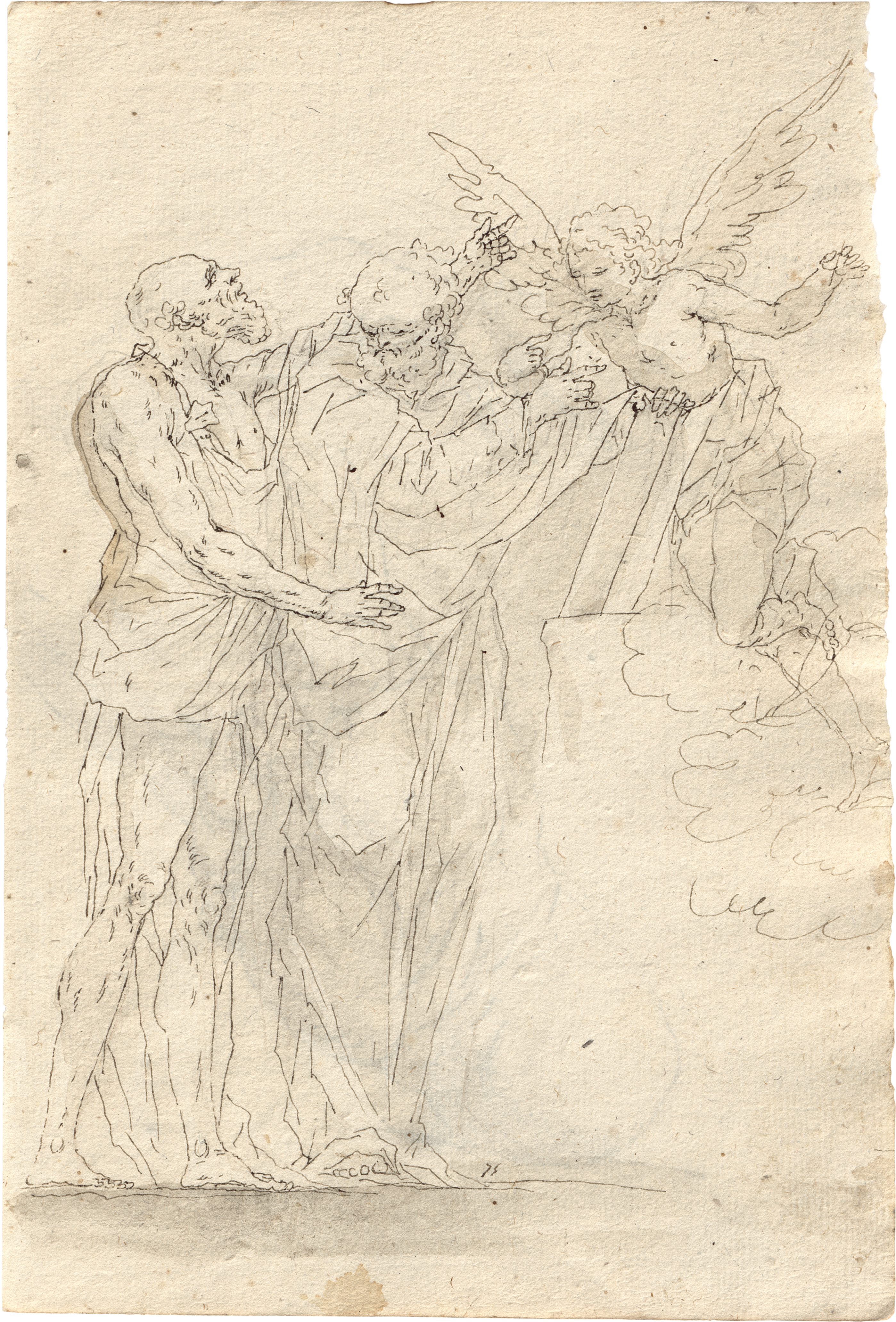 Kompositionsstudien zu biblischen Szenen: Gottvater in den Wolken, Engel, Detailstudien zu Händen und Füßen.