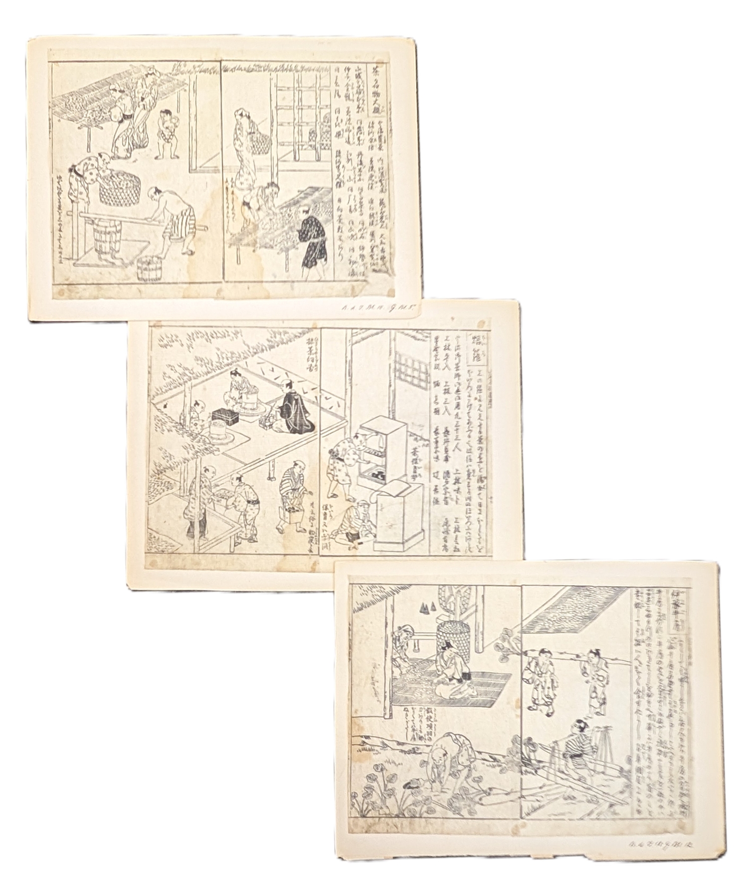 Sukenobu, Nishikawa und Kitao Shigemasa. 32 Holzschnitte mit figürlichen Darstellungen aus einer Heldensaga sowie Szenen des Alltagslebens verschiedener Berufsgruppen. Schwarzdruck auf feinem Japan, überwiegend doppelseitig aus Ehon-Alben stammend. Verschiedene Formate, oft chûban. Je ca. 21,5 x 28,5 cm. Lose Blätter überwiegend auf Trägerkarton montiert. Ende 18. Jahrhundert.