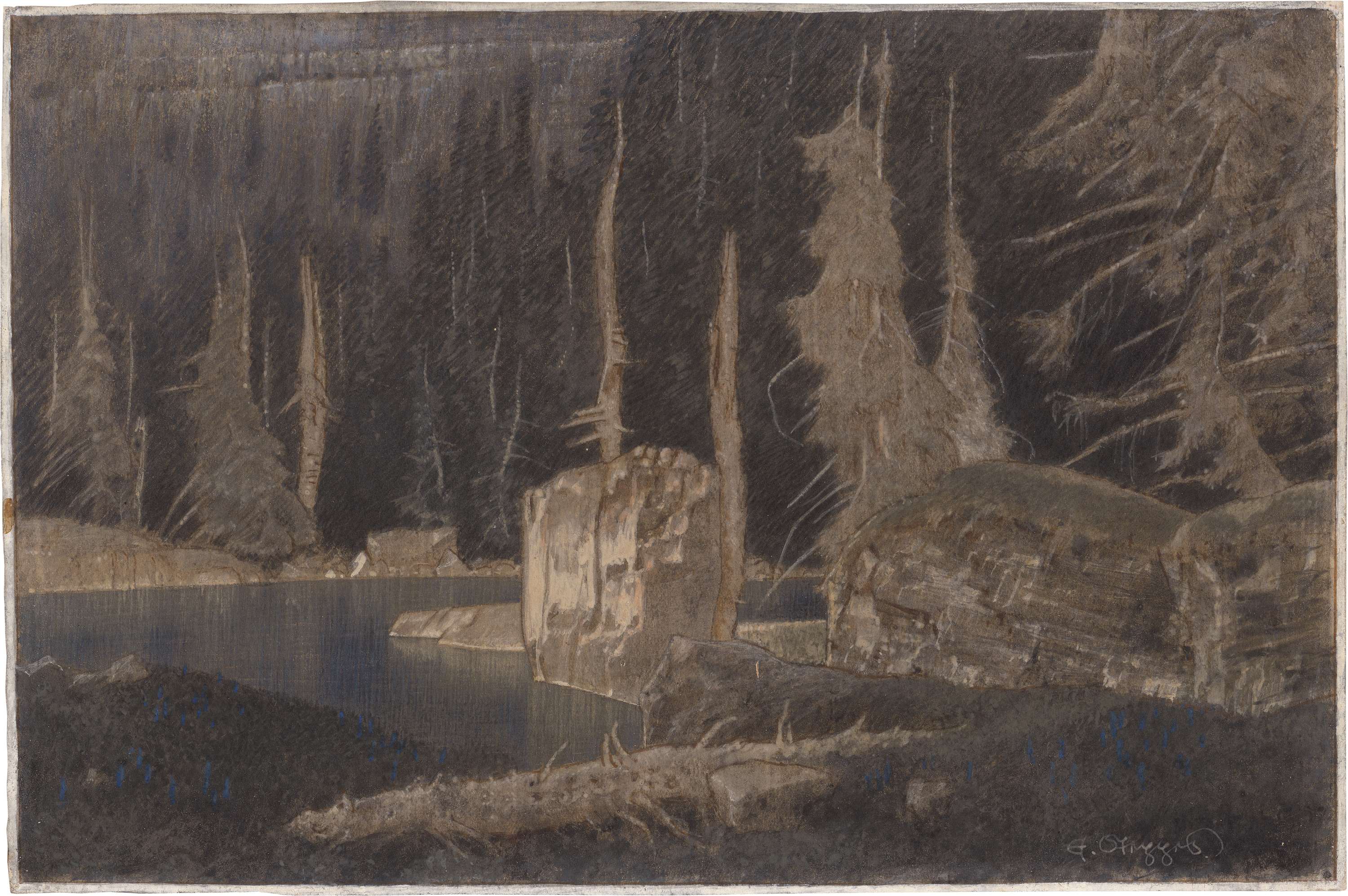 Tempera auf Papier, eigenhändig auf Platte aufgezogen. 19,6 x 29,5 cm. Unten rechts signiert "E. Steppes", verso eigenhändig betitelt "Das Urwaldauge", nochmals signiert "Edmund Steppes", sowie mit seinem Künstlersignet und weiteren eigenhändigen, schwer leserlichen Annotationen in Bleistift.