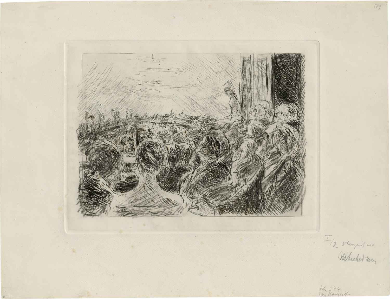 Einer von nur zwei bei Schiefler erwähnten Abzügen des ersten Zustandes, mit der noch ziemlich hellen Zeichnung, vor den Schattenpartien in den Vordergrundfiguren und der deutlich sichtbaren Figur des Dirigenten. Prachtvoller, samtiger Abzug mit stark ausgeprägter Plattenkante und mit breitem Rand, einige Partien mit Kreide überarbeitet. Der Arbeitsprozess des Künstlers wird hier sichtbar: Mit seinen Überarbeitungen bereitet Liebermann bereits die Entwicklung zum zweiten Druckzustand vor, indem er im Vordergrund Dunkelheiten hinzufügt, die er locker mit schwarzen Kreideschwüngen in den Druck zeichnet. Sehr selten.