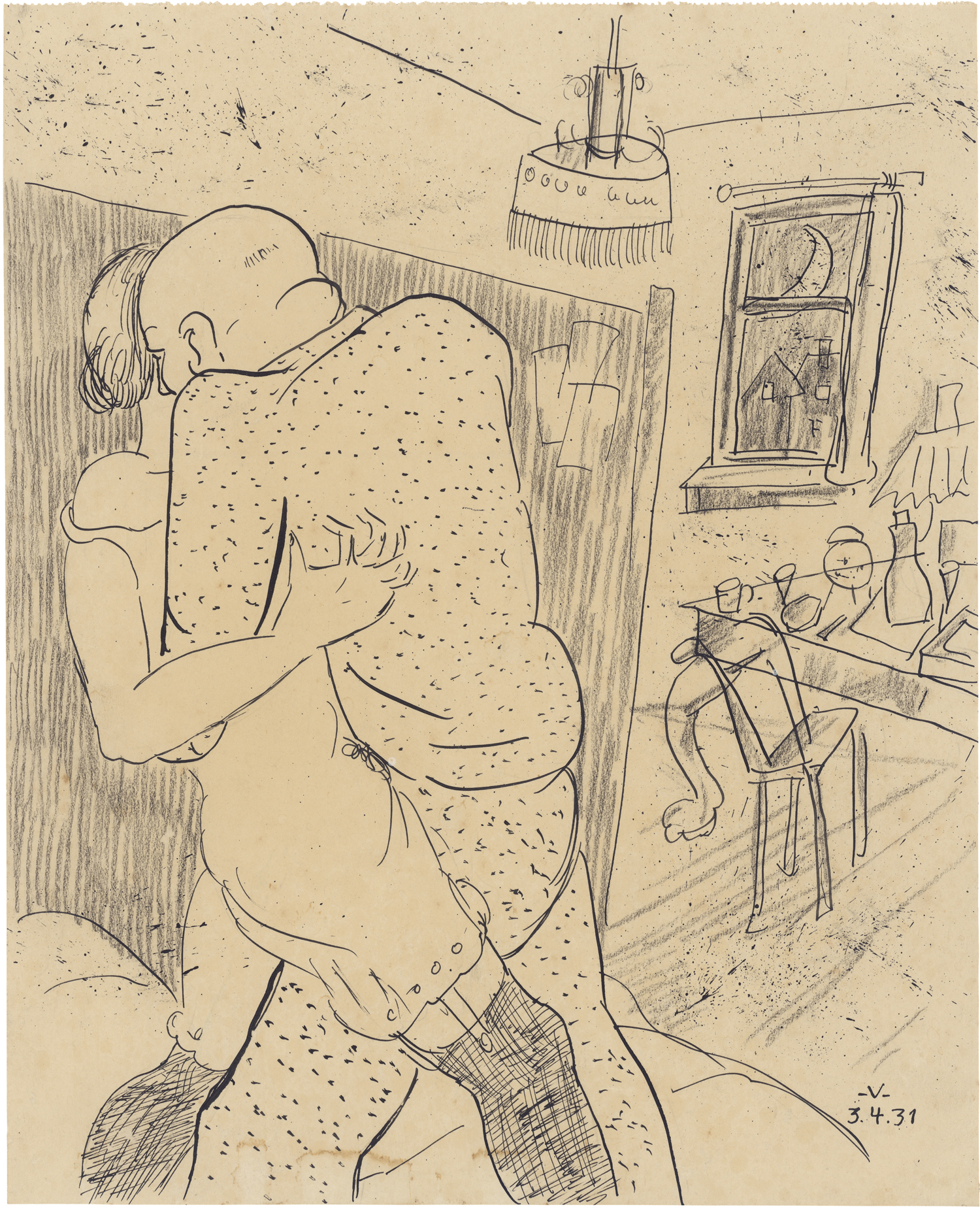 Ein nächtliches Ringen. Ob aber Liebe oder Drama, das bleibt offen. Die Frau ist bis auf die Unterwäsche entkleidet, der bullige Mann hält sie in enger Umarmung und drängt sie zum Bett, das ein Paravent vom Rest der Stube abtrennt. Bereits während seiner Akademiezeit in Weimar entdeckte Bruno Voigt seine Liebe zur Milieuzeichnung. Die Enge und Einrichtung des Raumes verdeutlicht, dass es sich bei der frühen Zeichnung wohl um eine Szene im Arbeiter- oder Kleinbürgermilieu handelt, die der Künstler mit lebendigen Federstrichen und sparsamen Schraffierungen der schwarzen Kreide erfasst.