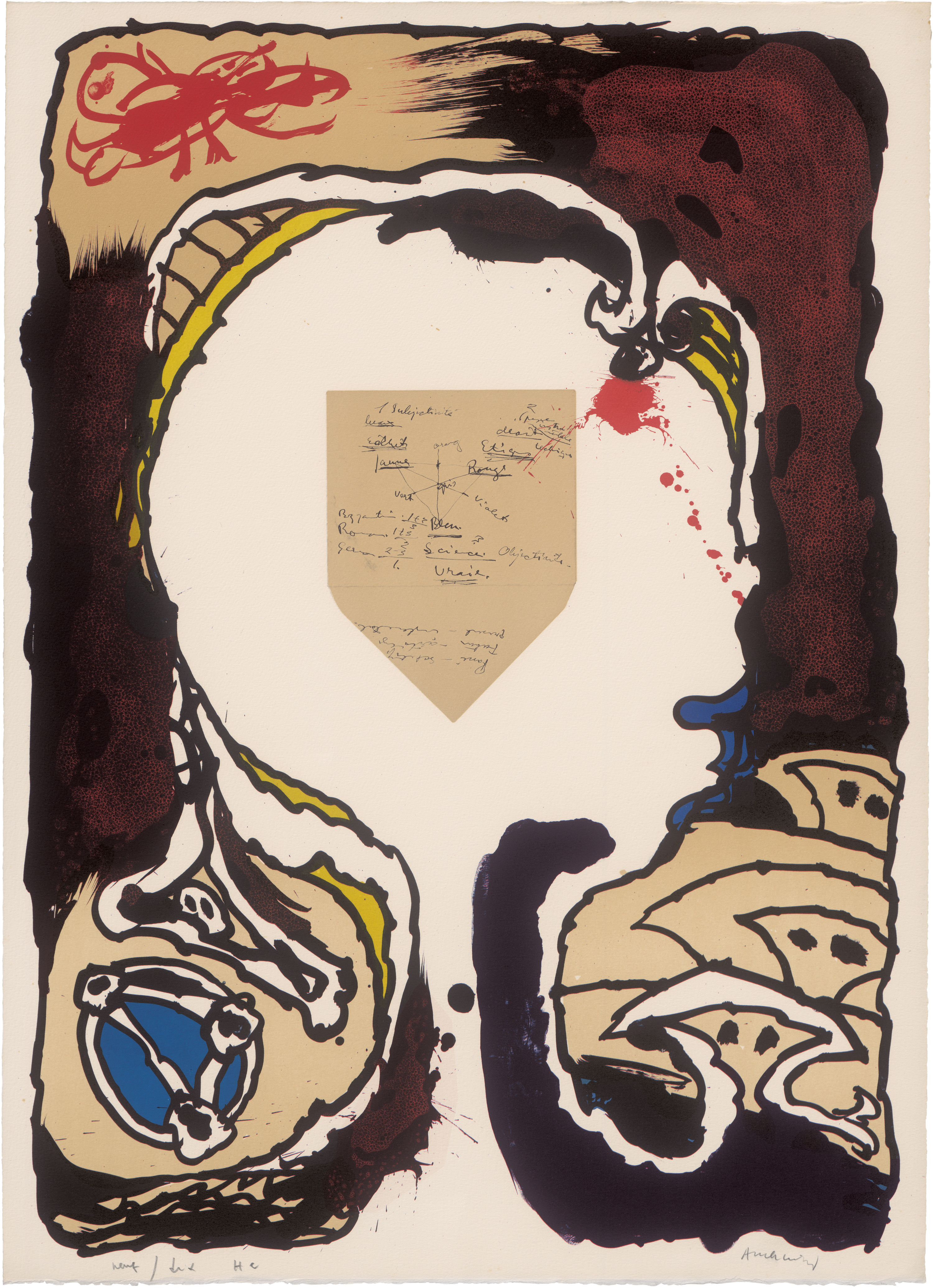 Eines von zehn "HC"-Exemplaren, neben weiteren Exemplaren, aus dem Mappenwerk "Pour Jorn", herausgegeben von den Editions Silkeborg Museum (Asger Jorn Foundation), Silkeborg 1976; Druck Clot, Bramsen & Georges, Paris. Prachtvoller, farbintensiver und differenzierter Druck mit dem vollen, kleinen Rand, unten mit dem Schöpfrand.