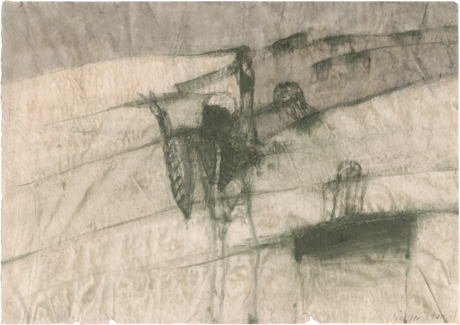 Eine schemenhafte Gestalt scheint verwoben mit dem Koordinatensystem des sie umgebenden Raums. In subtilen Andeutungen belassene Bildmotive und ein sensibler Umgang mit dem Material kennzeichnen Pichlers feinsinnig komponierte und nuancenreich gestaltete Zeichnung. Pichler, Bildhauer, Zeichner und Architekt, verschränkt in seinem Schaffen die verschiedenen Kunstgattungen miteinander. "Wenn man so wie ich sein Leben fast immer zeichnend begleitet, verselbständigt sich die Zeichnung, wird einmal Notation von Zuständen und dann wieder genaue Analyse, trägt zur Verwirrung und dann wieder zur Klärung bei. Ich könnte kaum denken, ohne zu zeichnen." (Walter Pichler, Es ist doch der Kopf, Ausst.-Kat. CFA Berlin und Tiroler Landesmuseum Ferdinandeum, Innsbruck 2007, S.5, zit. nach: sammlung-essl.at, Zugriff 28.09.2025).