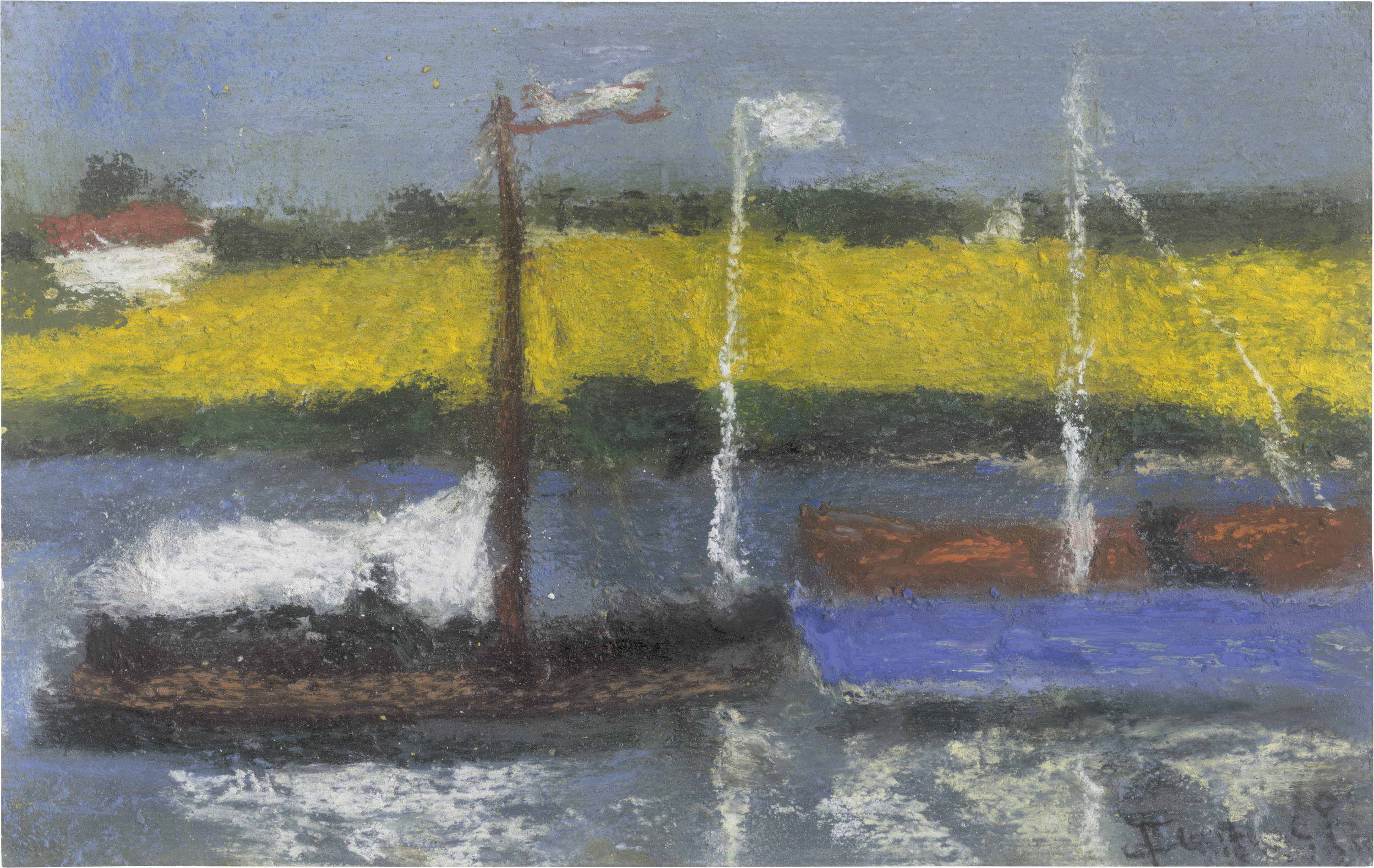 Boote ziehen auf dem Wasser im Vordergrund durch das Bild, ihre leuchtenden Farben bilden einen schönen Kontrast zum Gelb des Rapsfeldes dahinter. Die flache norddeutsche Landschaft an der Schlei hält Fußmann in leuchtenden, dick aufgetragenen Farben fest. In seiner zweiten, norddeutschen Wahlheimat findet der in Gelting arbeitende Künstler immer neue Motive, deren Farbspiel er begeistert in seinen Zeichnungen und Gemälden, vielfach in übereinander gestaffelten blockartigen Farbstreifen, einfängt.