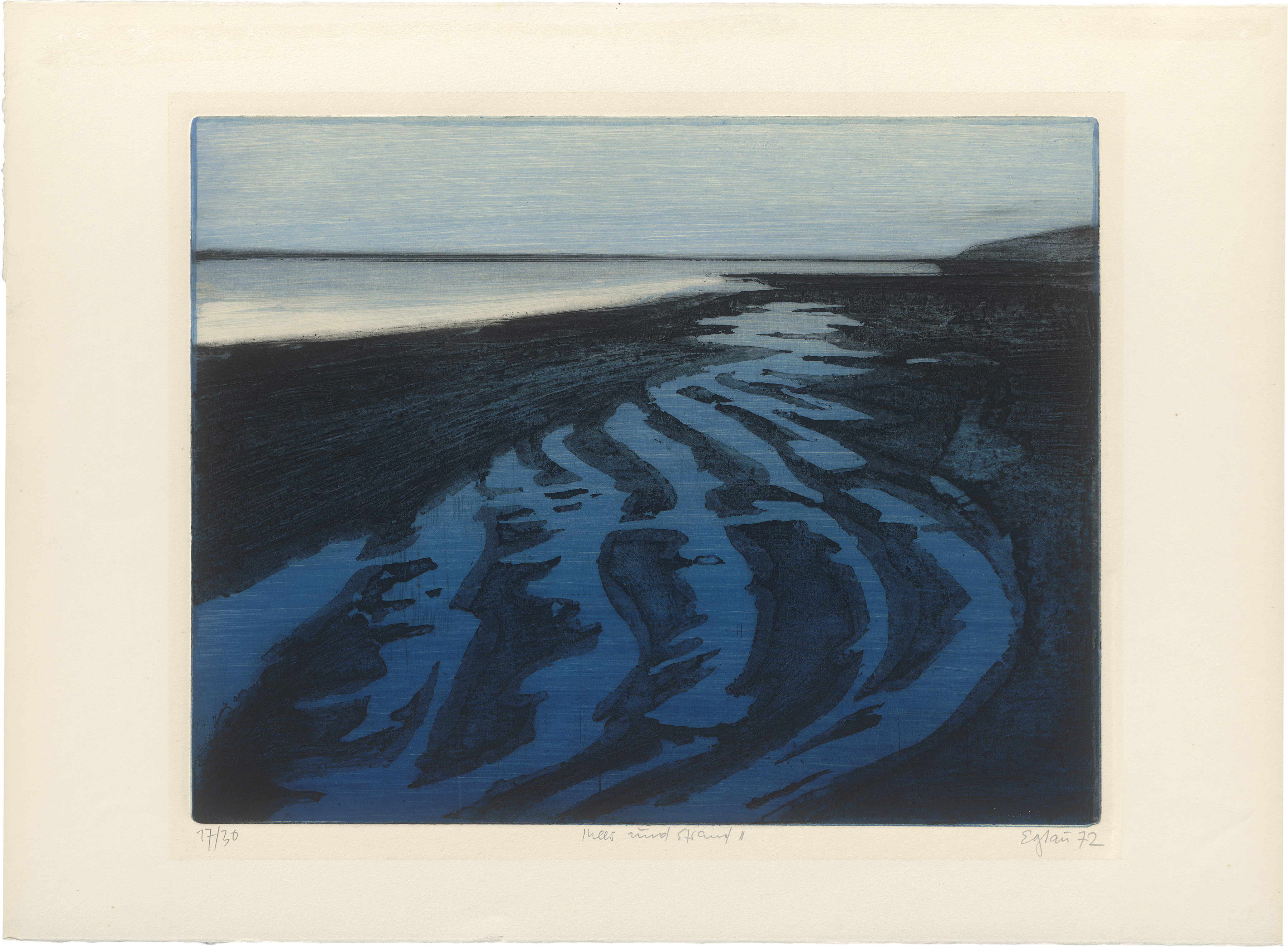 Die deutsche Nordseeküste, besonders die Inseln Sylt und Helgoland, vermittelten Otto Eglau Eindrücke, die in seinen Kompositionen der ruhigen und unscheinbaren Flächen des Wattenmeeres ihren abstrahierten Niederschlag fanden. Prachtvolle Drucke der großformatigen Radierungen, mit Rand.
