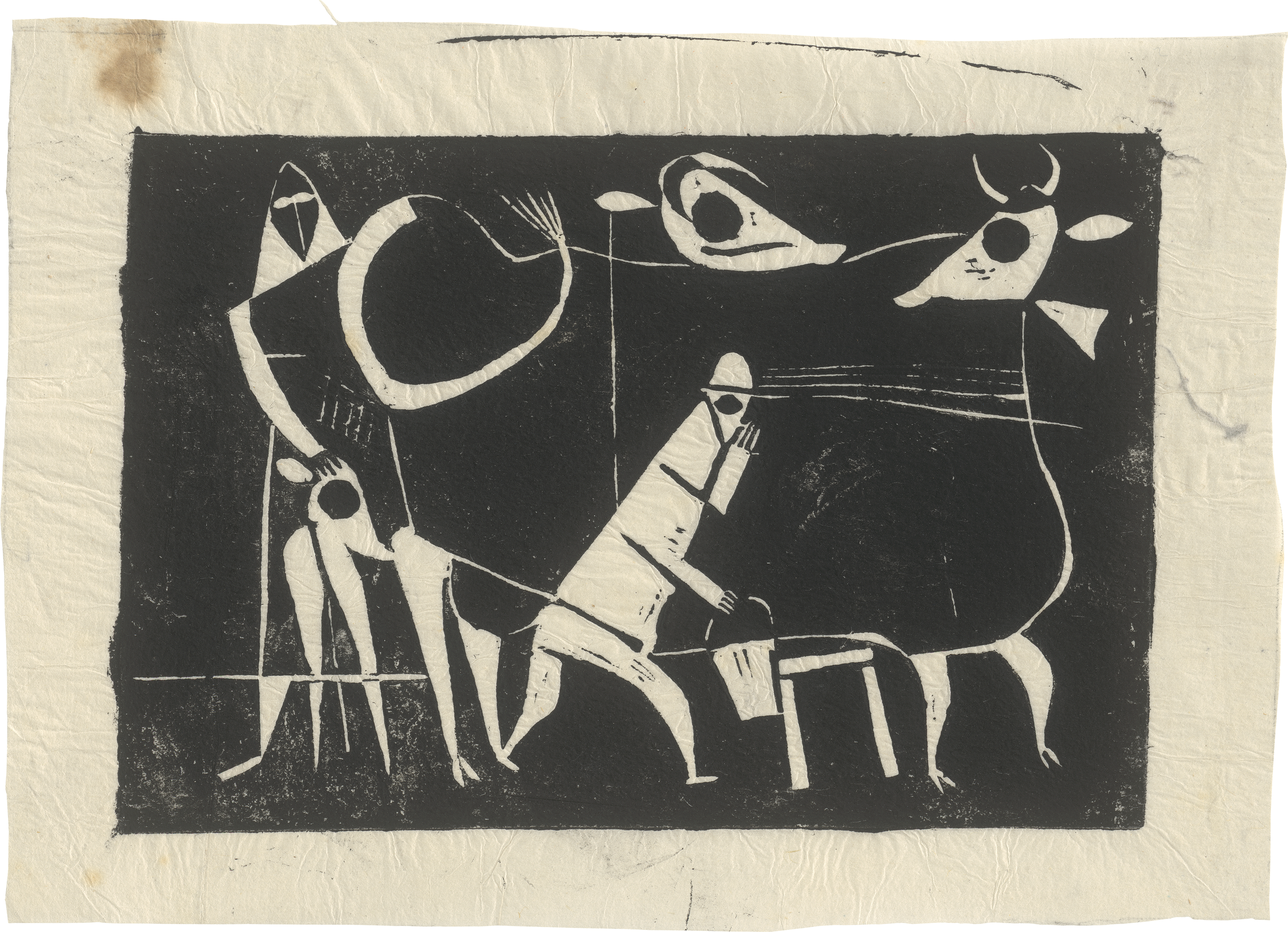 Exemplar des zweiten, endgültigen Zustandes mit den Zitzen am Euter der Kuh und weiteren Überarbeitungen. Sehr früher Holzschnitt des Künstlers, bei dessen Gestaltung bäuerlichen Lebens er sich noch weitestgehend der Technik des Weißlinienschnittes bedient. Ausgezeichneter, stellenweise etwas aufgelichteter Druck mit Rand. Selten.