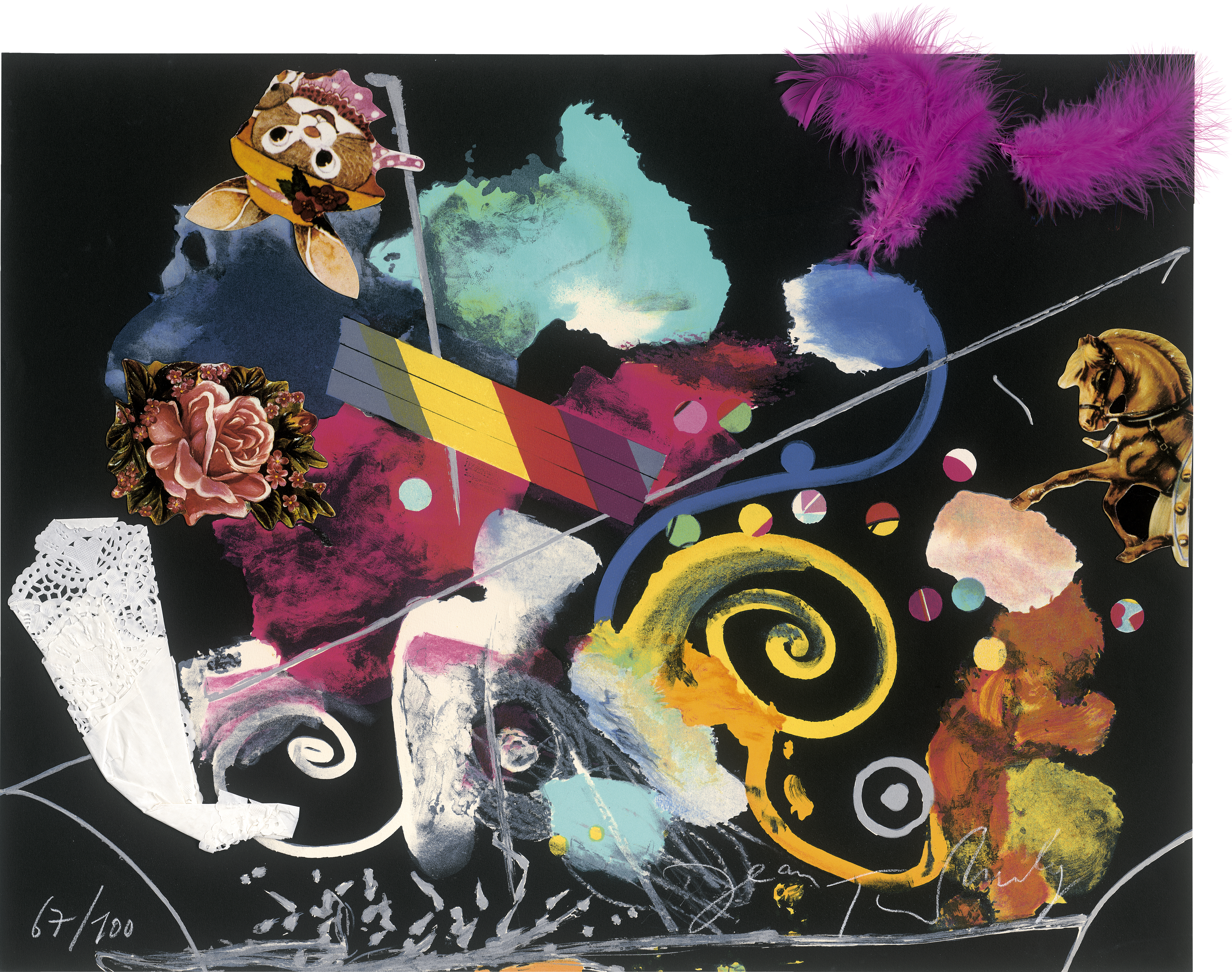 Die Exemplare der Auflage unterscheiden sich in der Gestaltung der Collagen sowie durch die verschiedenfarbigen Federn. Druck Desjobert, Paris. Prachtvoller Druck der formatfüllenden Komposition.