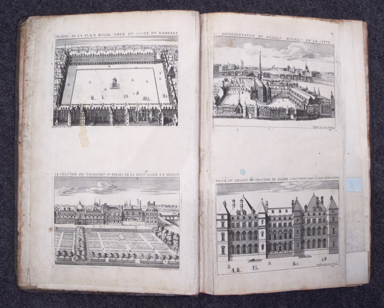Chastillon, Claude. Topographie françoise ou representations de plusieurs villes, bourgs, chasteaux, maisons de plaisance, ruines & vestiges d'antiquitez du royaume de France. 1 Bl. (Inhalt). Mit Kupfertitel, 157 Tafeln mit je 2 Kupfern, 45 doppelblattgroßen Kupfertafeln und 10 gefalteten Kupfertafeln. 44,5 x 28,5 cm. Leder d. Z. (stärker berieben und mit Schab- oder Kratzspuren, Rücken fachmännisch unter Verwendung alten Bezugsmaterials restauriert) mit RVergoldung und goldgeprägtem RTitel. Paris, Jean Boisseau, 1641.