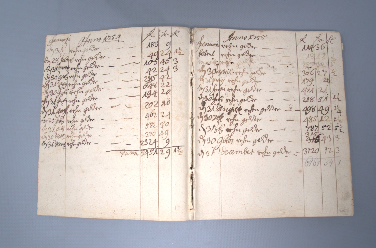 Aus dem heutige tschechischen Schloss Nový zámek (Neuschloß) stammendes Kontorbuch mit Hunderten von Einträgen der Jahre 1750-1761, die eine ganze Wirtschaftsgeschichte im Barock rekonstruieren lassen: "Ausgabe von NeuSchloß Monath January 1750". Zum Barockschloss gehört der Neugarten sowie die größten Parkanlagen Böhmens, die im Stil der englischen Gärten angelegt worden waren - und noch heute zu den bedeutendsten Tschechiens gehören.