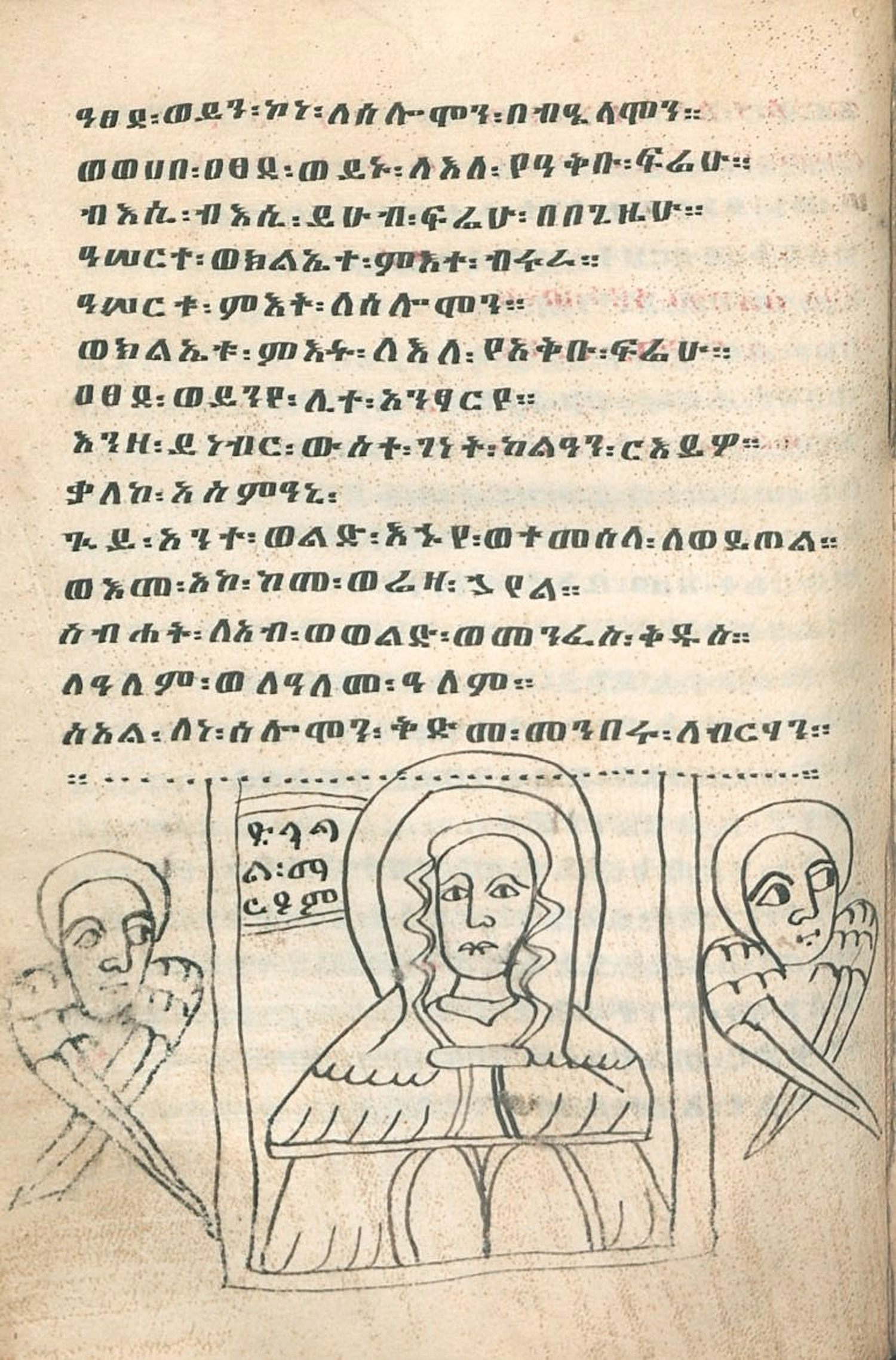 Ge'ez Erbauungs- und Andachtsbuch. Amharische bzw. Tigrinya Handschriften im Ge'ez Duktus auf Pergament. 142 nn. Bl. Schrift in Schwarz und Rot. Mit 3 (1 kolorierten in Rot und Schwarz) Federwerk-Teilbordüren als Kopfstücke, ganzseitiger Bleistift-Skizze des Heiligen Georg und halbseitige Federzeichnung der Muttergottes zwischen Seraphimen. 20,2 x 13,2 cm. Rotbraunes geglättetes Kalbsleder über kantigen Holzdeckeln mit reicher ornamentalen Blindgeprägung (nur minimal berieben, kaum abgegriffen). Äthiopien um 1820.