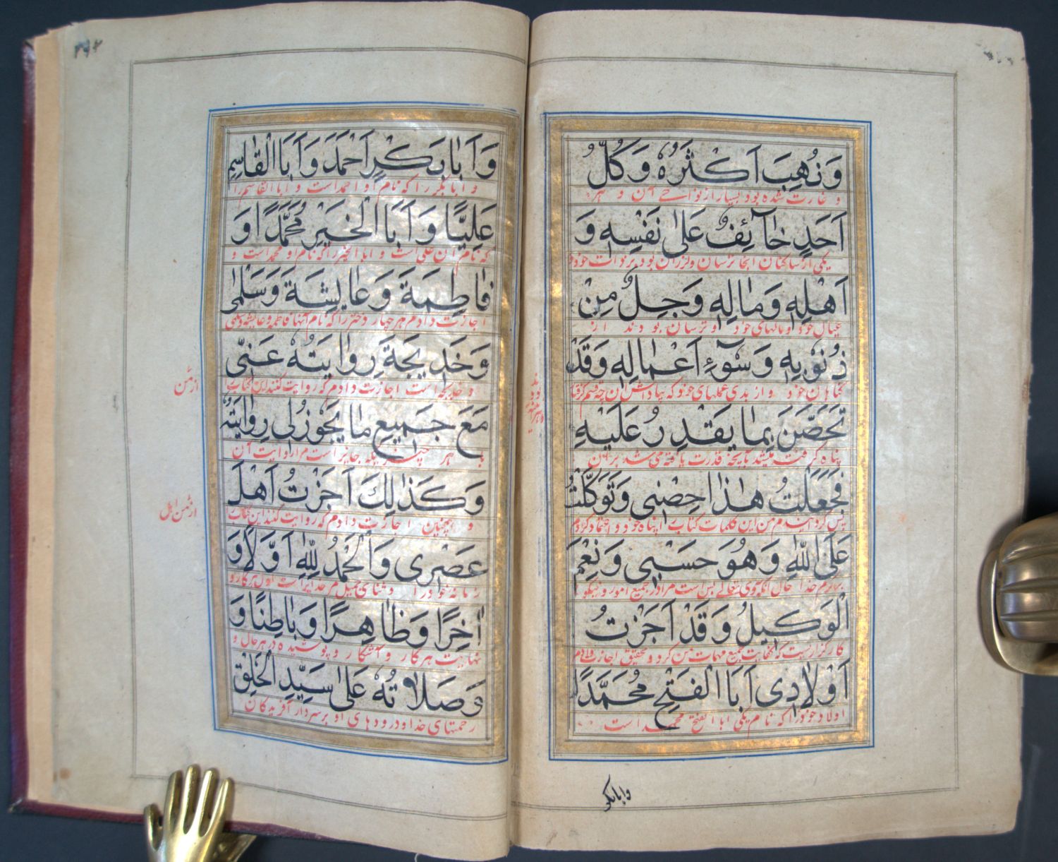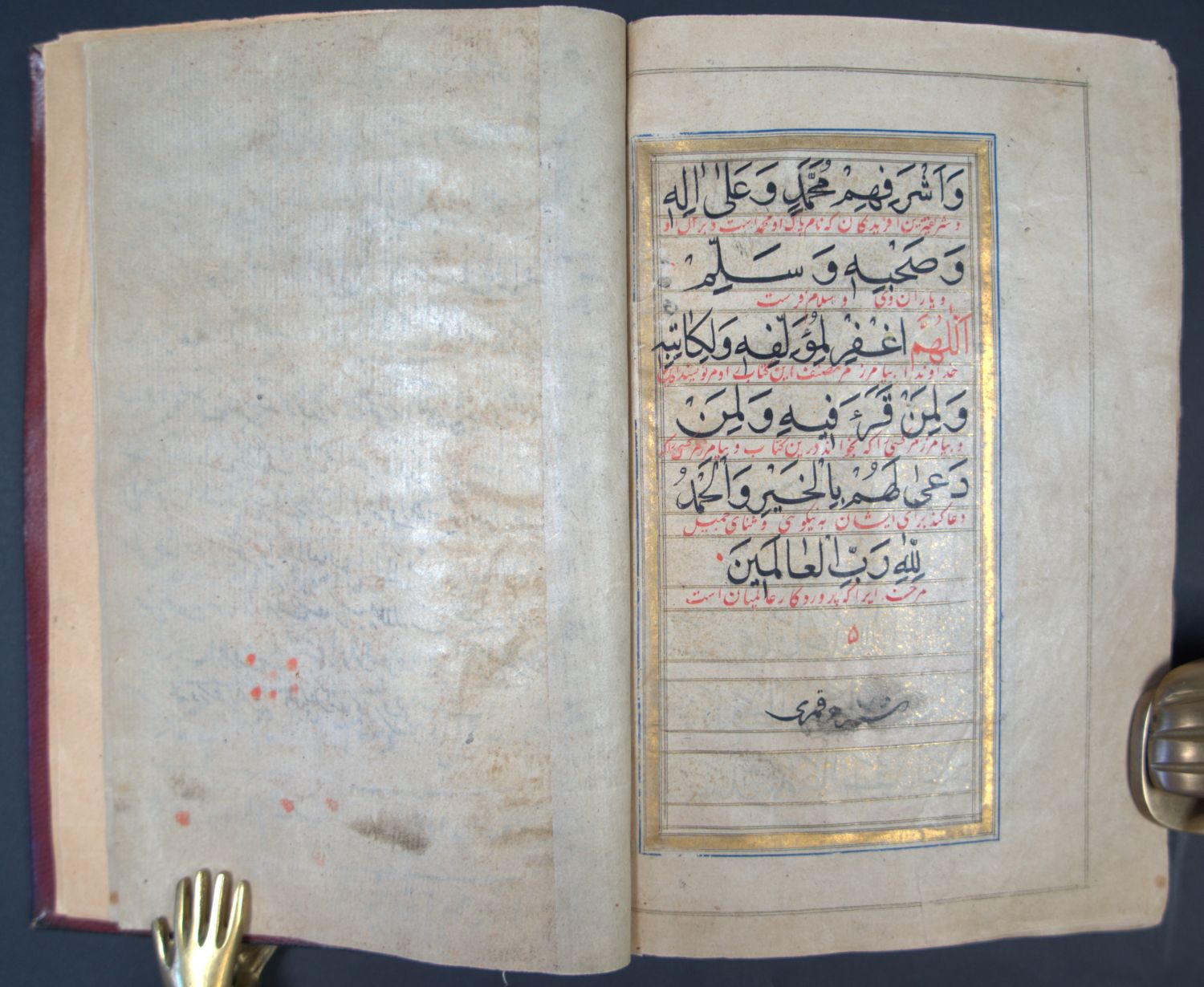 Ibn al-Dschazari (auch: Ibn al-Jazari bzw. Ibn-al-Gazari, Muhammad Ibn-Muhammad). Kitab al-hisn al-hasin min kalam saiyid al-mursalin (arabice: Abhandlung über Zeiten und Gelegenheiten zum Gebet für den Propheten Muhammad, zusammengestellt nach Traditionswerken). Persische Handschrift mit prachtvoller Illumination auf gelatiniertem Büttenpapier. 298 nn. Bl. 9 Zeilen mit den Versen in schwarzer Naskhi-Schrift und interlinearer Farsi-Übersetzung in Nastaliq-Duktus. Jede Seite mit breitem Goldrahmen in vielfachem schwarzen und blauem Lineament, Zeilentrennern in goldgefülltem Doppellineament, Auszeichnungen in roter Tinte und 7 besonders reich vergoldeten Doppelzierseiten Sar-lauh im Stil der typischen Carpet Pages in Lapislazuli-Blau mit breiter Rahmenornamentik in Blattgold, Lapisblau und teils mit Goldblumen und floralen Elementen in Hellblau, Rot, Orange und Grün. Schriftraum: 13,2 x 6,5 cm. Format: 19 x 12,5 cm. Schlichter schwarzbrauner Lederband des 19. Jahrhunderts (stärker berieben und beschabt, teils überarbeitet bzw. alt restauriert) mit goldgeprägten Deckelfileten (diese ebenfalls berieben). Persien (Shiraz, Isfahan?) 18. Jahrhundert.