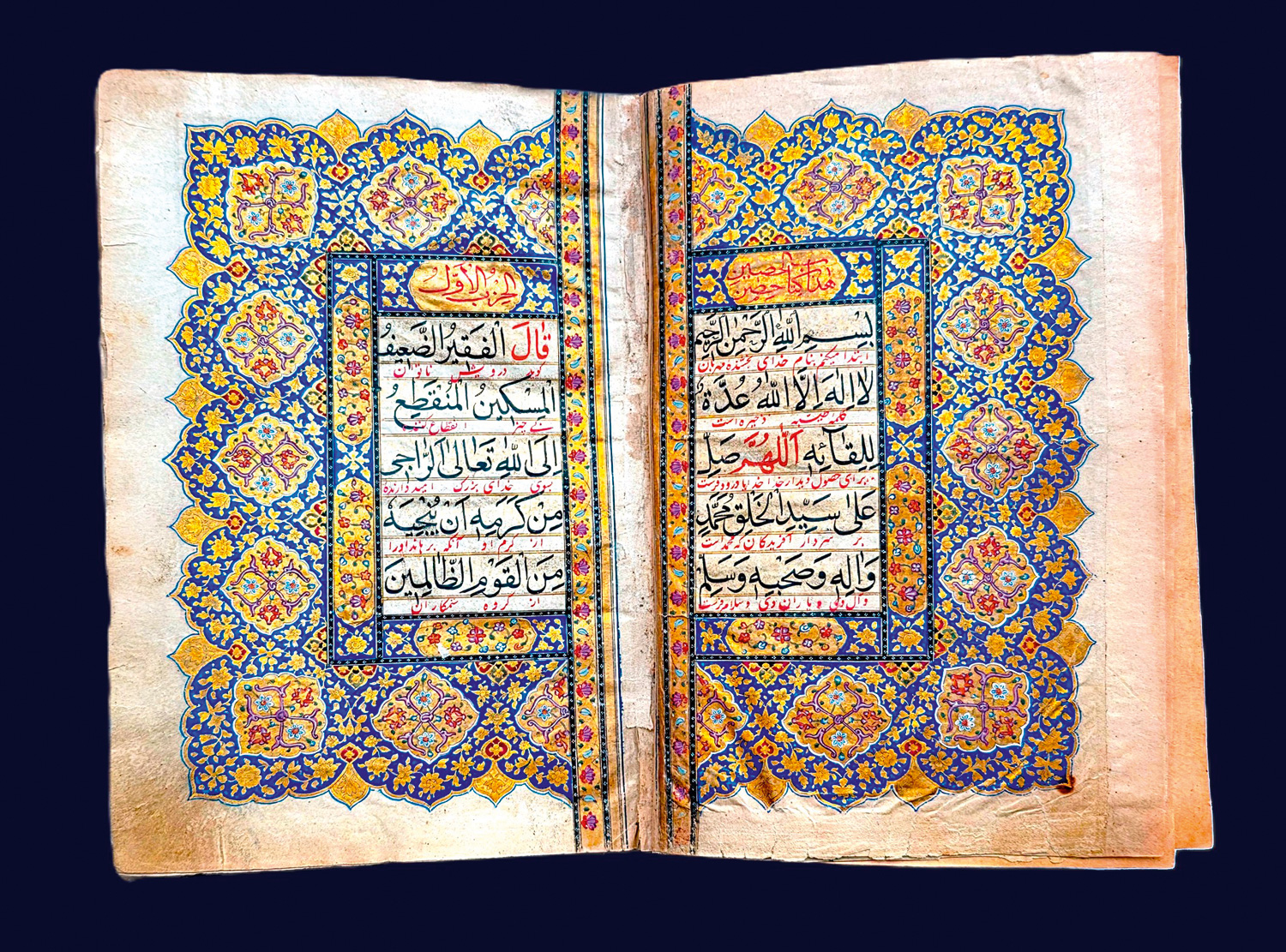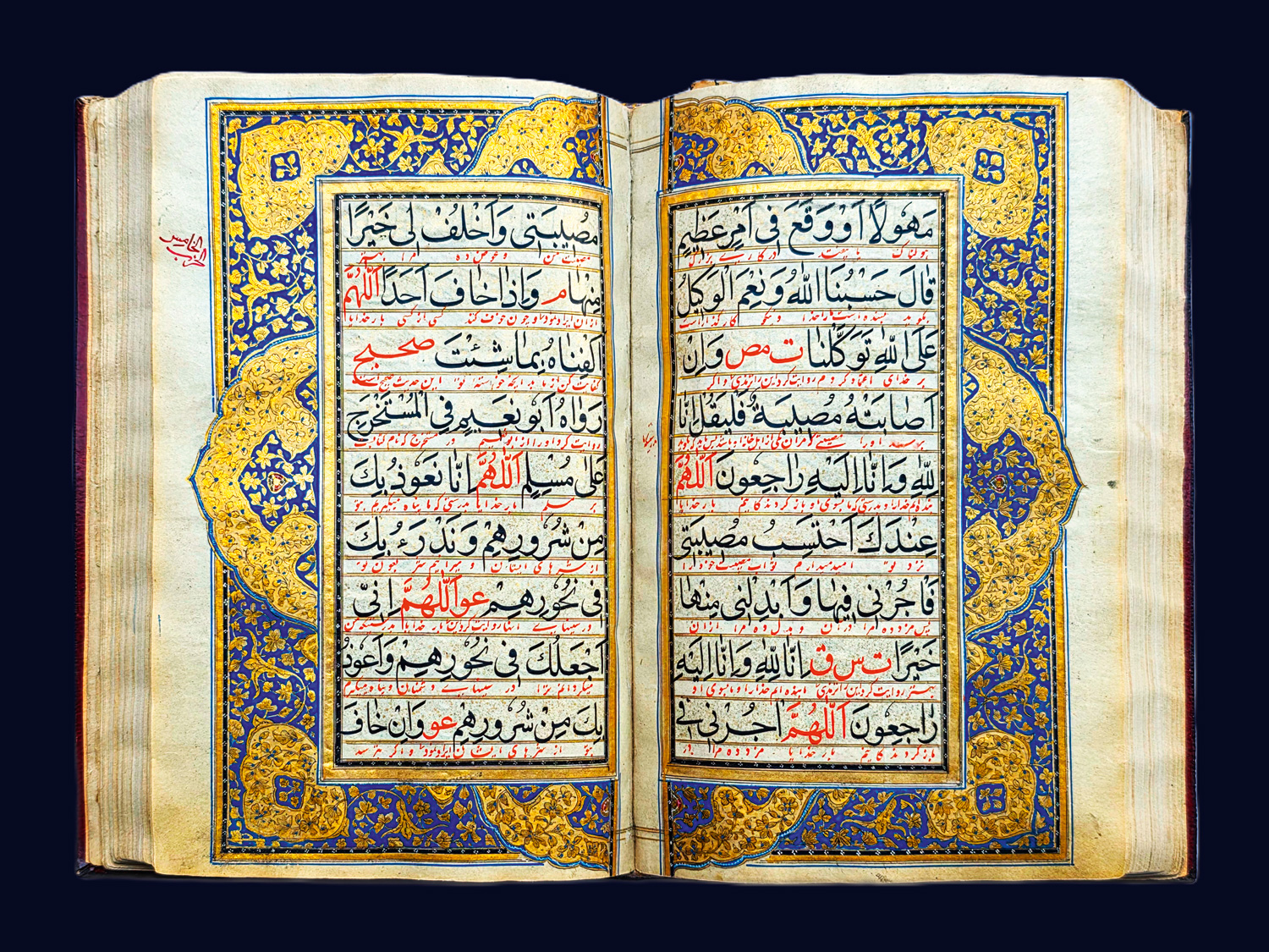 Während der mystisch-heiligen Urtexte in hoher aufrecht gezogener, minimal nach links kippender schwarzen Kalligraphie im Naskhi-Duktus und mit Auszeichnungen in Rot, etwa für den Gottesnamen "Allah", "Der Mächtigste", "Der Allerbarmer" etc., geschrieben wurde, sind in den schmaleren Zeilen dazwischen - jeweils unter dem arabischen Urtext - Übersetzungen in Farsi im Nastaliq-Duktus. Die Textanlage mit den interlinearen Übersetzungen ist typisch für die Koranschulen und Schreiberwerkstätten in Isfahan oder Shiraz, teils auch in Teheran, in der Übergangszeit vom späten Safawiden- zum Qajar-Reich (18. und 19. Jahrhundert). Die Künstler der Kitabkhana (Werkstätten bzw. Schreiberateliers) zeichneten sich nicht nur durch eine Rückbesinnung auf klassische Stile, sondern auch durch neue, phantasievolle Ornamente aus, die ganz besonders minutiös und nuanciert ausgearbeitet waren, so daß Koran- und Gebetshandschriften entstanden, die für die reiche Mittel- und Oberschicht, den Hof und wohlhabende Händler gedacht waren. – Nur leichte Handhabungsspuren, der erste Ziertitel mit kleinen Knitterspuren und sauberer Randansetzung, sonst kaum Randläsuren, gelegentlich etwas stock- und braunfleckig. Vorsätze mit arabischen Annotationen von alter Hand. Vereinzelt auch im Textblock Randkommentare in Rot. Mit wenigen hinterlegten Randläsuren und kleinen Randausbrüchen. Insgesamt altersgemäß in herausragend gutem Zustand.