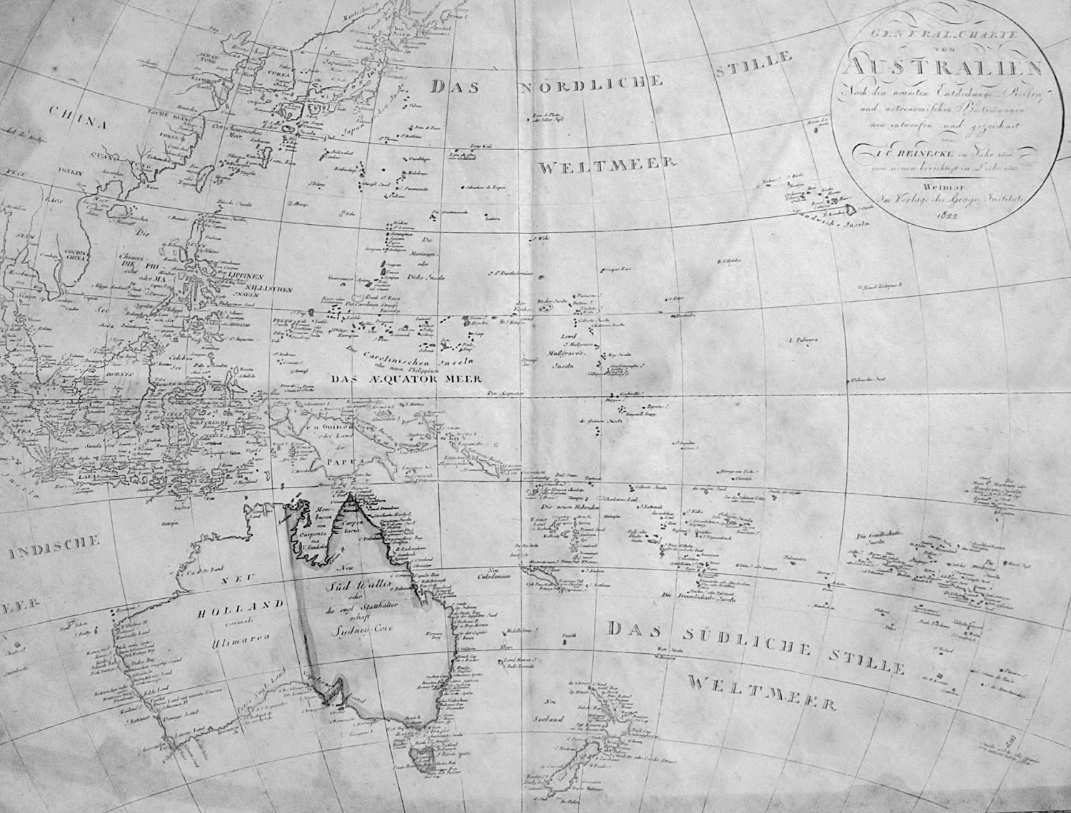Reinecke, Johann Christoph Matthias. General-Charte von Australien. Nach den neuesten Entdeckungs-Reisen und astronomischen Bestimmungen. Grenzkolorierte Kupferkarte. 47 x 63,5 cm (Passepartout). Unter Glas mit Passepartout in goldgeprägter Holzprofilleiste. Weimar 1822.