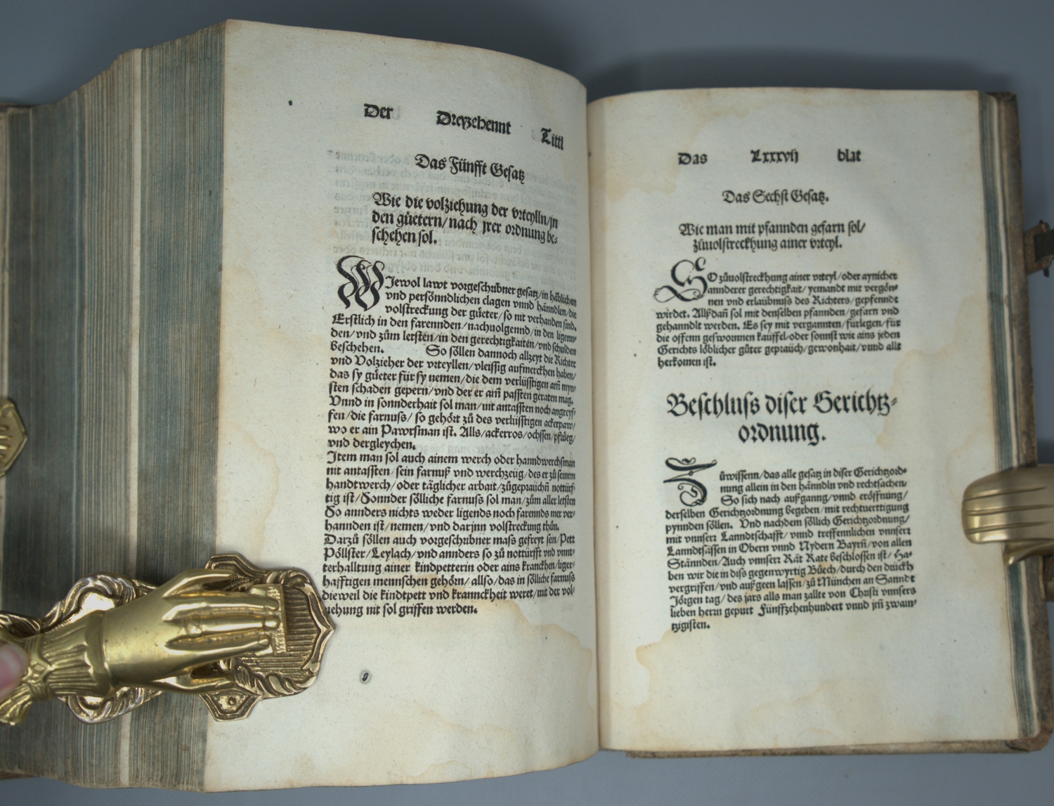 Vorhanden sind: I. Reformacion der bayrisch(e)n Lanndrecht nach Cristi unsers Hailmachers geburde Im Fünftzehenhundert unnd Achtzehendm Jar Aufgericht. 36 nn. Bl. CLXVIIII Bl. (1535). - VD16 B 1008. - II. Das Buech der gemeinen Landpot Landförderung Satzung umd Gebreuch des Fürstenthumbs in Obern umd Nidern Bairn im fünftzehenhundert umd sechtzehendem Jar aufgericht. 12 nn. Bl., LXVII Bl., 1 nn. Bl. (1520). VD16 B969. - III. Gerichtsordnung im furstnthumb Obern und Nidern Bayrn Anno 1520 aufgericht. 16 nn. Bl., LXXXVII Bl. 1520. VD16 B991. - IV. Die new Erklärung der Landsfreyhait des loblichen Haus und Fürstenthumbs Obern unnd Nidern Bairn. Anno fünfftzehenhundert unnd im Sechtzehenen auf den vierungzwainzigistn tag des Monats Aprilis zu Ingelstat aufgericht. 18 Bl. (1545). - VD16 B 982. - V. Die Ordnung uber gemainer Lanndtschafft in Bayrn auffgerichte Hanndtuesst. Tausentfünfhundert und im sechsehenden jar zu Ingolstat beschlossen. 7 Bl. (1545). - VD16 B 1006. – Vorderes Innengelenk verstärkt. Titel mit hinterlegter Fehlstelle, teilweise etwas fingerfleckig und durchgehend mal stärker mal schwächer feuchtrandig. Sonst gutes Exemplar.
