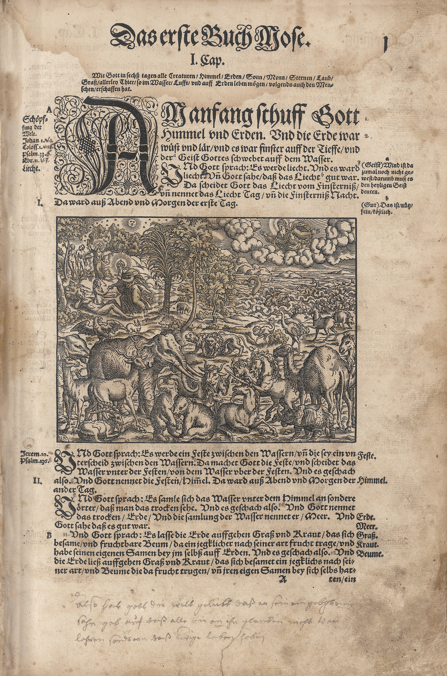 VD16 ZV 1505. Heitz Tafel XXXV, Nr. 34. Vgl. Schmidt 245-247. – Frühe seltene Ausgabe aus der Offizin von Georg Rab, W. Han und S. Feyerabend. Erstmals im Jahre 1564 in der Offizin von S. Feyerabend erschienen. Enthält das Alte und Neue Testament, "Die Propheten all deutsch" und "Biblisch Namen und Chronick Buch". Mit den vereinzelt monogrammierten Holzschnitten von J. Bocksperger und Jost Amman (1539-1591). "Die tiefe Verbundenheit des Künstlers mit dem Text offenbart sich besonders im alten Testament auf Schritt und Tritt. Es ist ein echtes Suchen nach konkreter Vorstellung der heiligen Geschichte, die turmhoch über dem hohlen Pathos der späteren Bibelillustration steht. Die von Jost Ammans Künstlerhand selber geschnittenen Bilder ... gehören zu den besten Bibelillustrationen, die uns der alte Protestantismus hinterlassen hat." (Schmidt). – Titel knapp beschnitten und auf Papier aufgezogen, Porträt und zwei Blätter der Vorrede als moderne Kopie eingebunden. Vereinzelte Seiten verstärkt, insgesamt etwas braun- und fingerfleckig, etwas feuchtrandig, vereinzelt mit kleineren Einrissen und hs. Notizen. Dritter Titel mit größerer Fehlstelle (rechte untere Ecke), Blatt 292 mit größerer Fehlstelle.