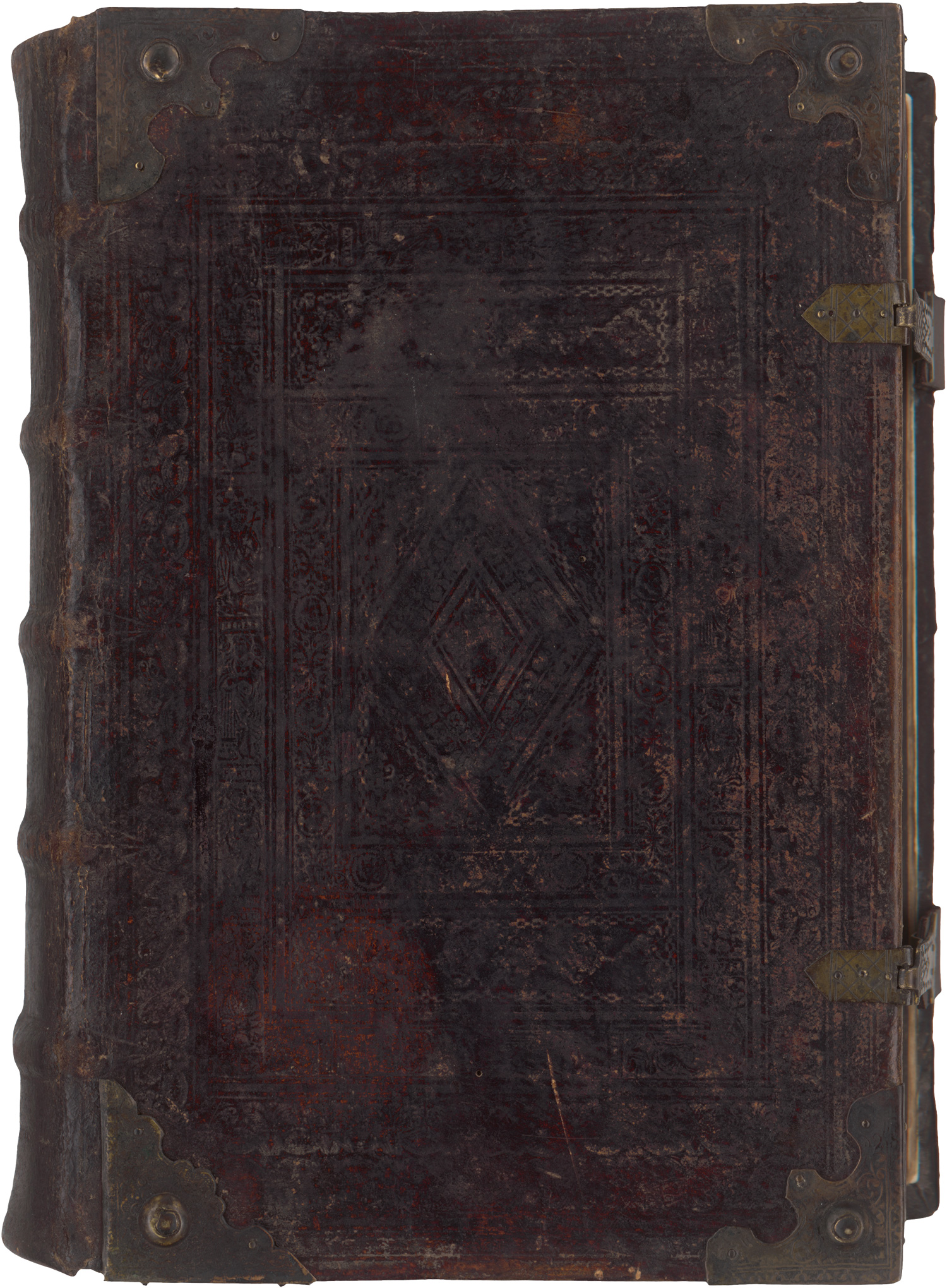 Biblia germanica. - Biblia. Das ist: Die gantze heylige Schrifft, Teutsch. D. Mart. Luther. 4 Teile in 1 Band. 20 Bl., 316 num. Bl.; 216 num. Bl.; 370 num. Bl., 2 Bl; 82 Bl. Mit 2 großen Holzschnitt-Titelbordüren, großer Holzschnittvignette und 141 teils später, unfachmännisch ankolorierten Textholzschnitten von J. Bocksperger und J. Amman ohne das Holzschnitt-Porträt. Titel in Rot und Schwarz. 35 x 23,5 cm. Leder d. Z. (berieben, mit kleinen Fehlstellen und Kapitale mit teils hinterlegten Einrissen) über Holzdeckel und 7 Bünden mit 8 Messingbeschlägen und zwei Messingschließen. Frankfurt, (Georg d. Ä. Rab, Erben W. Han und S. Feyerabend), 1569.
