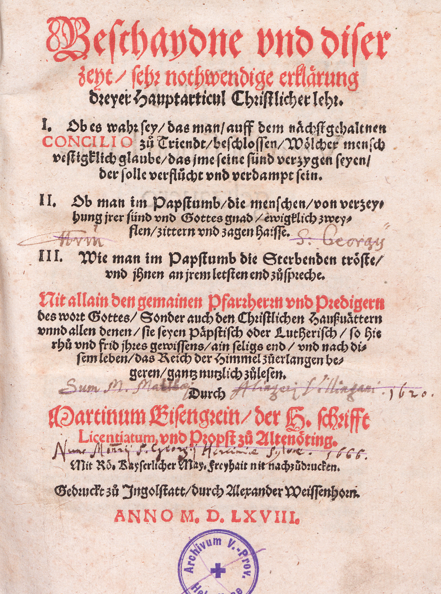 VD16 E 779. Stella 559. Nicht bei Adams. – Einzige Ausgabe. Der in Stuttgart geborene Martin Eisengrein (1535-1578) kam um die Mitte des 16. Jahrhunderts nach Wien, wo er um 1560 als Domherr in St. Stephan nachweisbar ist. Maximilian II. ernannte ihn zum Hofprediger. Von Wien ging er als Theologieprofessor nach Ingolstadt und zuletzt nach Passau. – Innengelenk brüchig, etwas gebräunt und fleckig. Fl. Vorsatz und Titel mit hs. Besitzvermerk und Stempel.