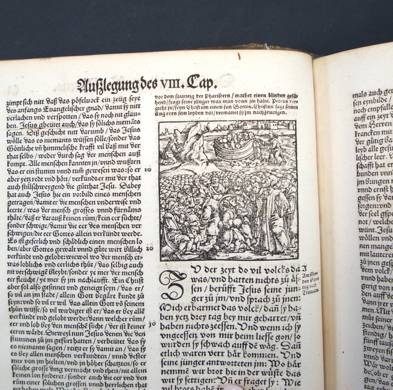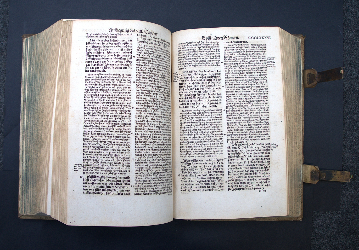 Erasmus von Rotterdam, Desiderius. Paraphrasis oder Postilla Teütsch. Das ist klare Außlegung aller Evanglischen unn Apostolischen Schrifften des Neuwen Testaments. 32 Bl., CCCCCXCIII num. Bl. Mit Holzschnitt-Druckermarke auf dem Titel und zahlreichen Text-Holzschnitten. 30,5 x 19,5 cm. Schweinsleder d. Z. (berieben, bestoßen und fleckig) über abgefasste Holzdeckel, fünf Bünden und mit zwei Messingschließen. (Zürich, Froschauer, 1552).