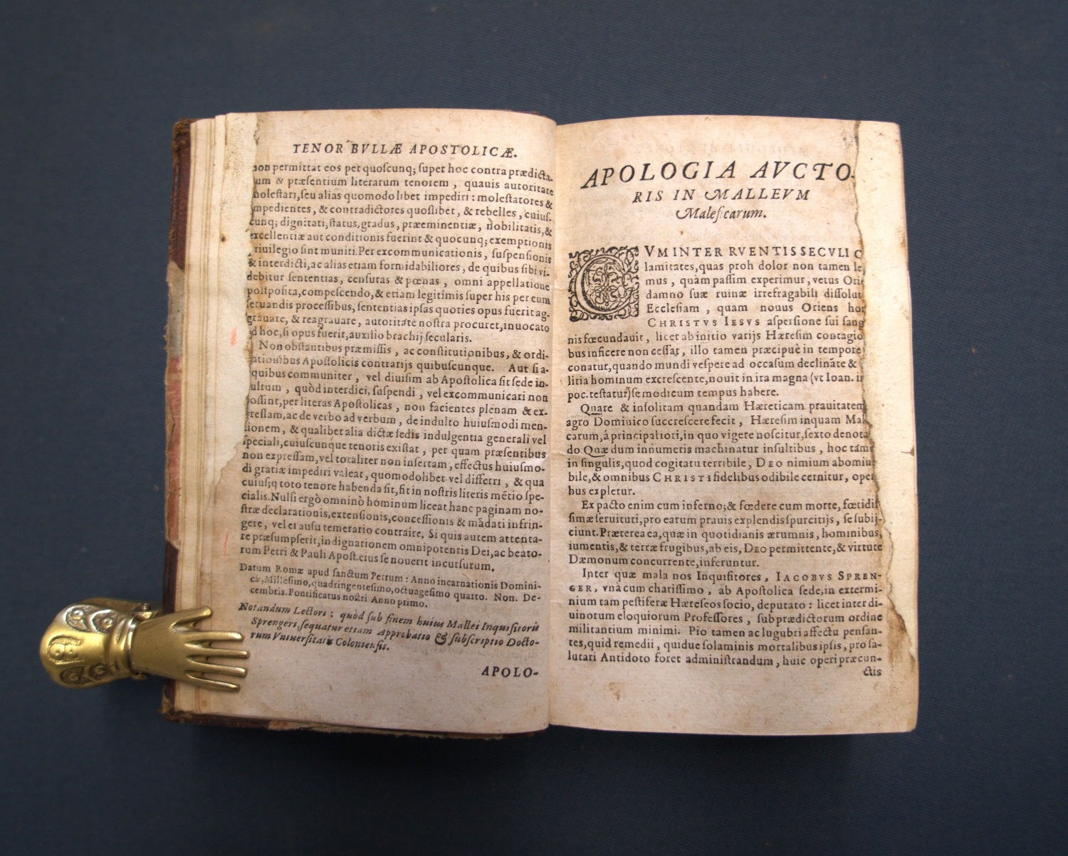 Die Autorschaft seines Mitbruders Jakob Sprenger, die auch im vorliegenden Exemplar, das von dem Servitenmönch Raffael Maffei herausgegeben und überarbeitet wurde, erhalten blieb, ist nach heutigem Forschungsstand hingegen umstritten und wird als Verleumdung beschrieben, da Sprenger sich als Gegner der Hexenverfolgung bekannte (Vgl. Tschacher, Lexikon zur Geschichte der Hexenverfolgung). – Nur der erste Band vorhanden. Knapp beschnitten, Titel mit Fehlstelle (Text etwas betroffen), ersten sechzehn Blätter mit größerer bis kleinerer hinterlegten Fehlstelle am Außensteg, die letzten fünfundzwanzig Seiten mit Feuchtrand sowie durchgehend etwas stockfleckig.