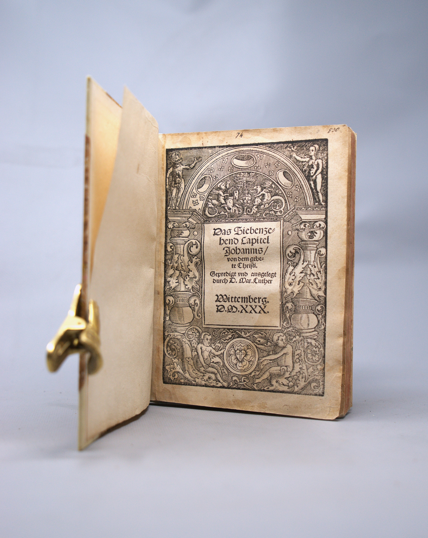 VD16 L 6690. Benzing 2753. Kuczynski 1720. Knaake 607 – Erste Ausgabe. Luthers Wochenpredigten über Kapitel XVII des Johannesevangeliums fanden 1528 und 1529 jeweils an Samstagabenden statt. Caspar Cruciger (1504-1548), der wahrscheinlich selbst Hörer war, edierte sie schliesslich auf Bitten Luthers und auf Grundlage der Aufzeichnungen Georg Rörers (1492-1558). Da die vorliegende Predigt vom Text Rörers erheblich abweicht, dürfte Cruciger noch auf andere Quellen, vermutlich auch auf seine eigene Mitschrift, zurückgegriffen haben. – Durchgehend mal mehr, mal weniger, teils auch stärker gebräunt, fleckig und feuchtrandig sowie mit einigen alten Annotationen.